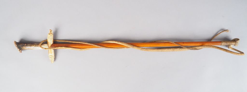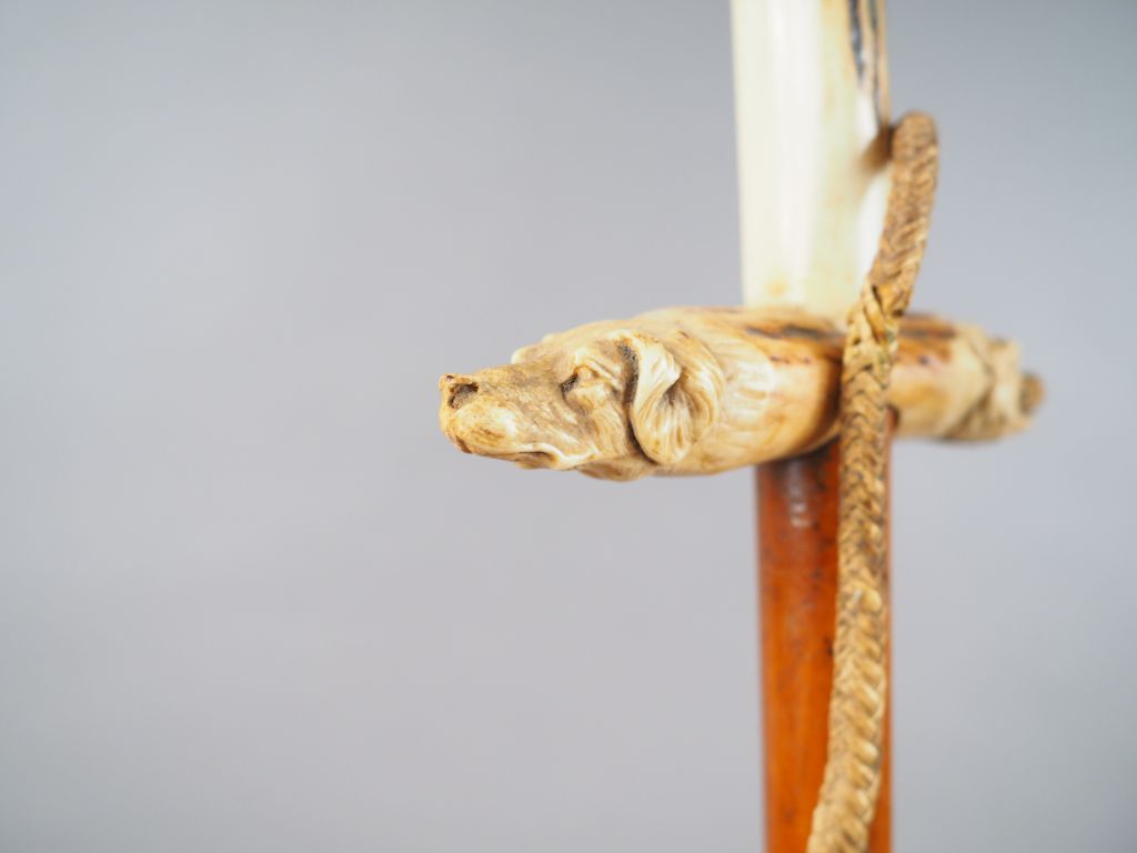 Dague de vènerie en corne sculptée, à décor de tête de chien de chasse et de hure de sanglier, lame gravée à décor de trophées (petit accident au cuir tressé du fouet).