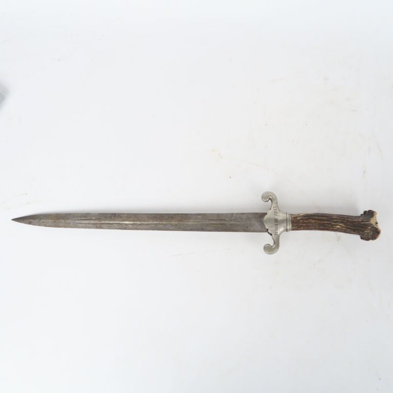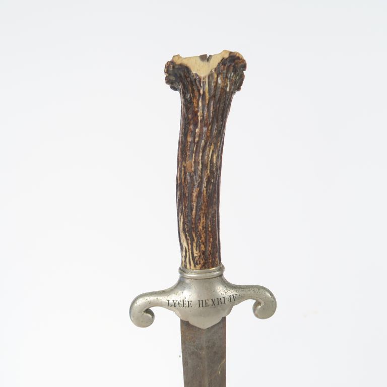 Dague de vénerie « LYCEE HENRI IV » Poignée en bois de cerf (éclat). Croisière argentée, gravée « LYCEE HENRI IV ». Lame droite à arrête médiane et gouttière. A.B.E. SF.