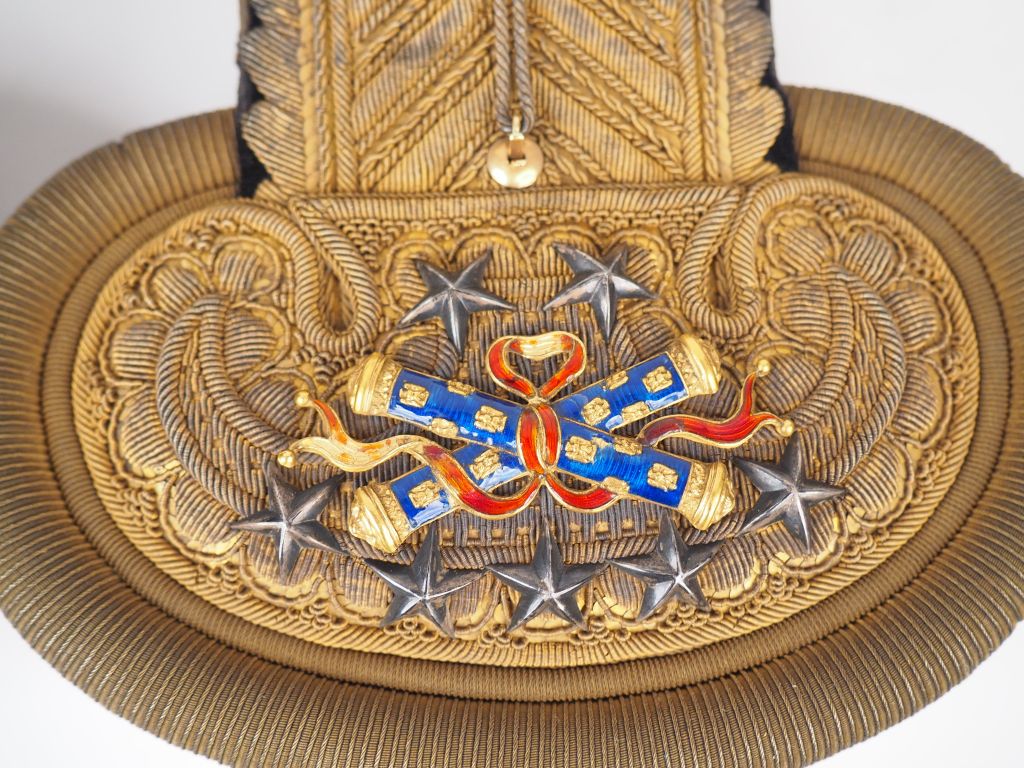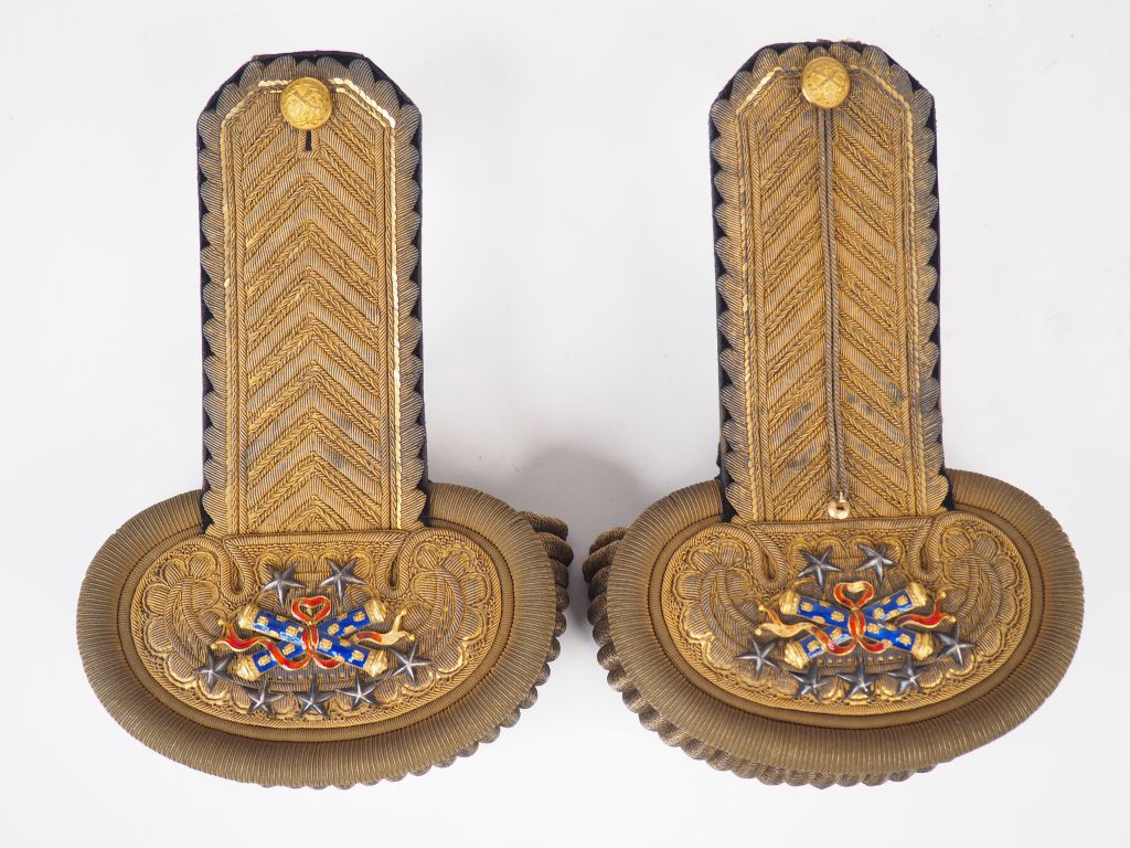 Dans une grande boite arrondie en molesquine vert Empire à garnitures (poignée et verrous) en laiton on trouve sur un lit de velours rouge sombre avec signature dorée dans le couvercle « BIDAL 3 Rue Richelieu Paris » une somptueuse paire d’épaulettes de maréchal d’Empire ayant appartenu au maréchal Elie-Frédéric Forey (1804/1872). Corps brodé à décor en bâtons en « V » alterné de chevrons inversés en filigrane doré, le tout encadré d’un feston sur fond de velours noir. Ecusson au bouclier surligné d’un semi de sequins doré brillant entouré d’une tournante unique dorée mat. Franges en grosse torsade captives dorées. Sept étoiles rapportées entourent (5 en bas 2 au-dessus) une paire de bâtons de maréchal polychromes noués par un ruban rouge construction en laiton doré et émail grand feu.