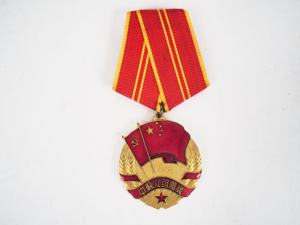 Décoration célébrant l’amitié Sino-Soviétique, module bronze uniface en bronze et émail rouge drapeaux soviétique et chinois, étoile rouge et texte doré sur fond rouge. Avec son ruban rouge et jaune montage sur plaque. (Etat 1)