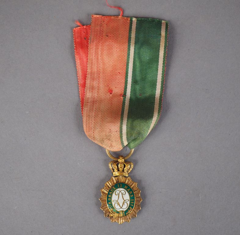 Décoration pendante du "Brassard de Bordeaux" en or, modèle en forme de soleil rayonnant couronné ( module à couronne mobile), les centres identiques bombés sur les deux faces reprenant le motif de la jarretière verte et or portant le texte « Bordeaux 12 Mars 1814 » entourant deux lettres « L » dorées, opposées et entrelacées (quelques manques discrets à l’émail ne défigurant pas l’insigne). Intéressant ruban mixte aux couleurs du brassard vert à deux raies blanches et rouge feu de la décoration de St Louis ou de la Légion d’honneur Restauration, les couleurs du ruban sont assez fraiches. Cette belle décoration destinée à remplacer le brassard fut attribuée au maximum à 1100 personnes en comptant certains officiers anglais et personnalités royalistes bordelaises de l’administration municipale. Lors de la Révolution de Juillet 1830, les partisans des Bourbons furent activement « épurés » et un grand nombre de décorations détruites ce qui en fait un insigne d’une extrême rareté fort difficile à trouver. Etat 1-