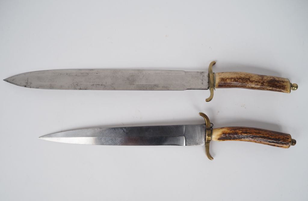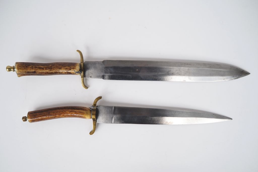 Deux couteaux de chasse. Manches en bois de cerf. Montures en laiton, garde à deux quillons inversés. -un à lame à méplat médian. Longueur : 42,5 cm. -un à lame à arête médiane. Longueur : 37 cm. A.B.E. SF. XXe siècle.