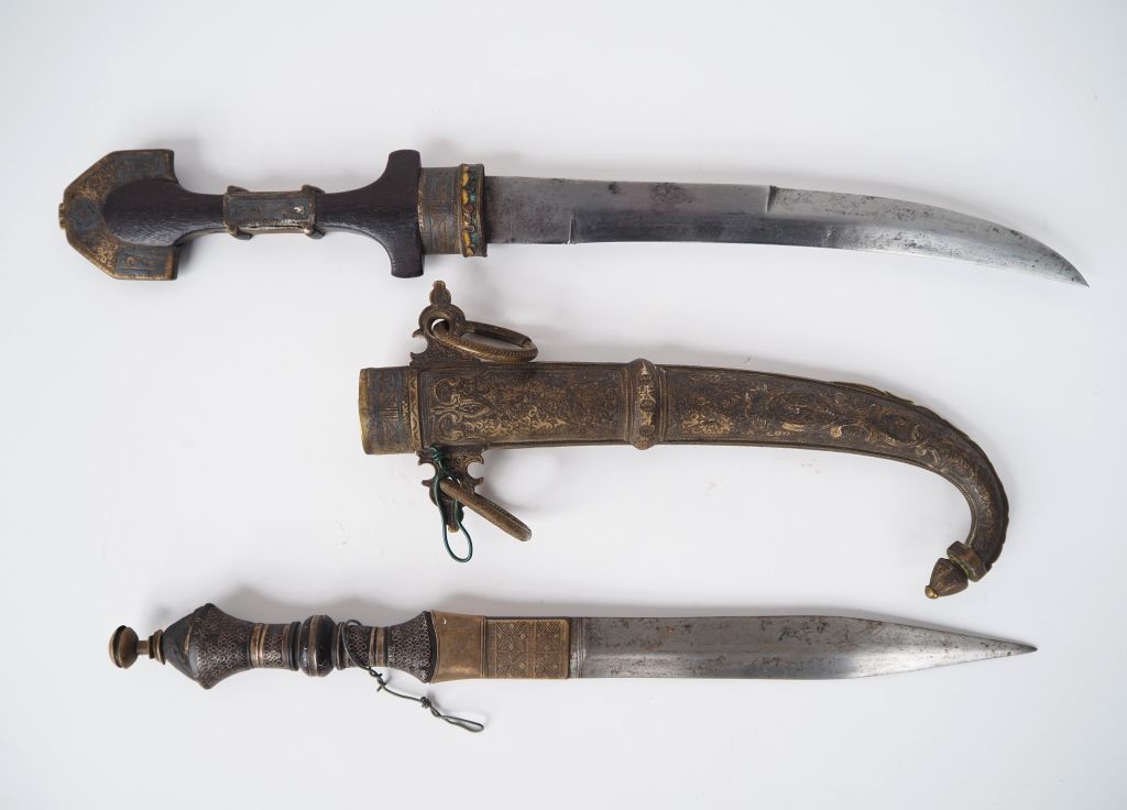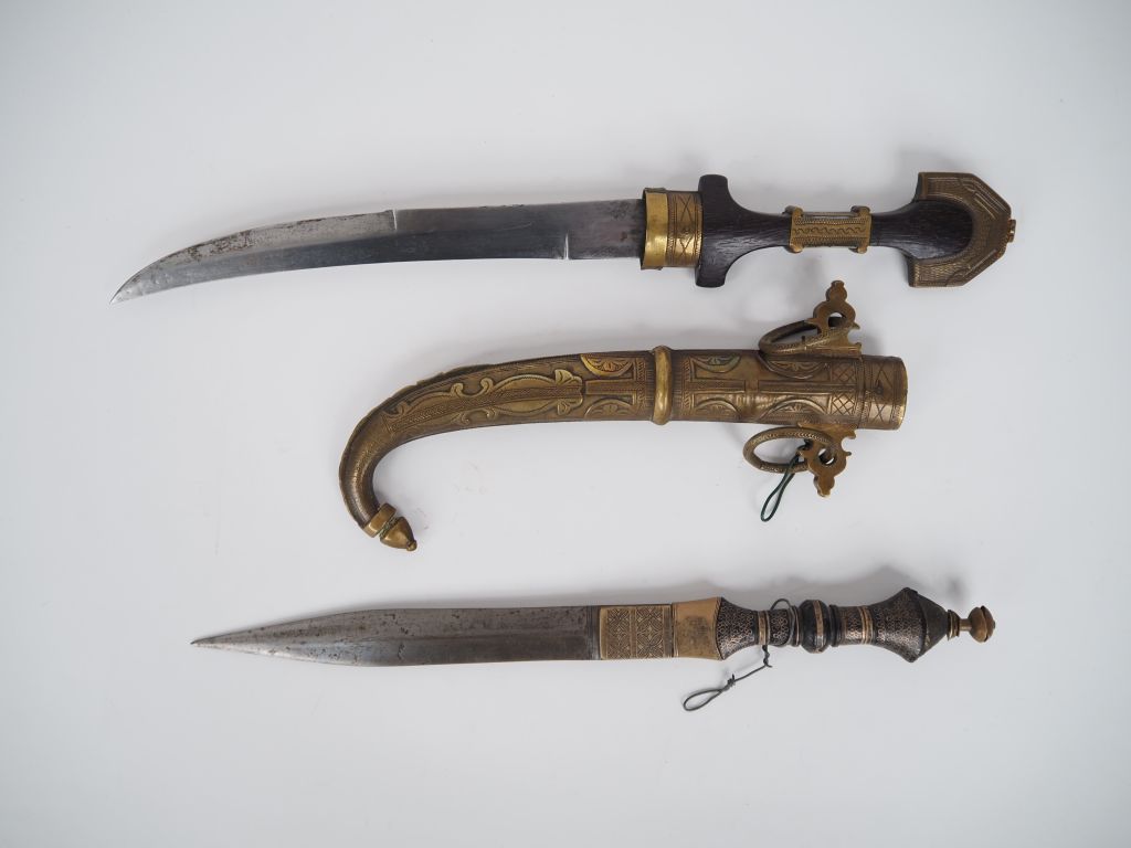 Deux poignards : -un touareg. Poignée en bois à décor d’incrustations de laiton (manques). Lame à arête médiane. SF. Longueur : 34 cm. -Poignard Koumyah. Poignée en bois. Lame à dos et contre tranchant. Fourreau à deux anneaux de suspente en laiton, avec restes d’argenture, et d’une frise émaillée.