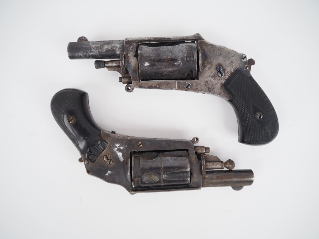 Deux revolvers Hammerless, cinq coups, calibre 6 mm Velodog. Détentes pliantes. Finitions en partie bleuies. A.B.E. et E.M. (Accident mécanique et manque le recouvrement de la bride de crosse). Vers 1880
