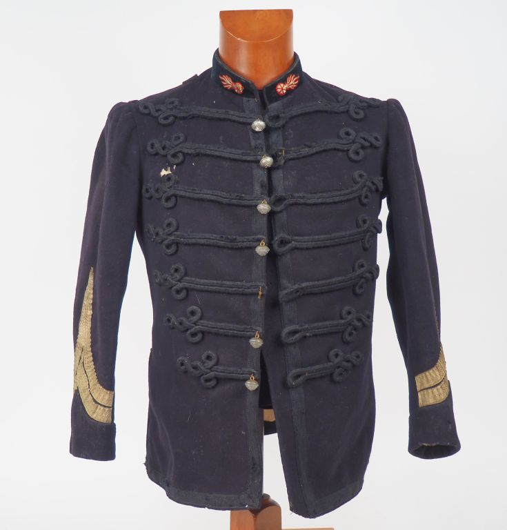 Dolman-pelisse en drap noir, d’officier des sapeurs-pompiers, col noir à la grenade surlignée de rouge, face avant de l’habit ornée de brandebourgs noirs, boutons blancs à la grenade marqués « Sapeurs-pompiers » et 2 galons de bas de manche. Léchures de mites et trous. Etat 2-.