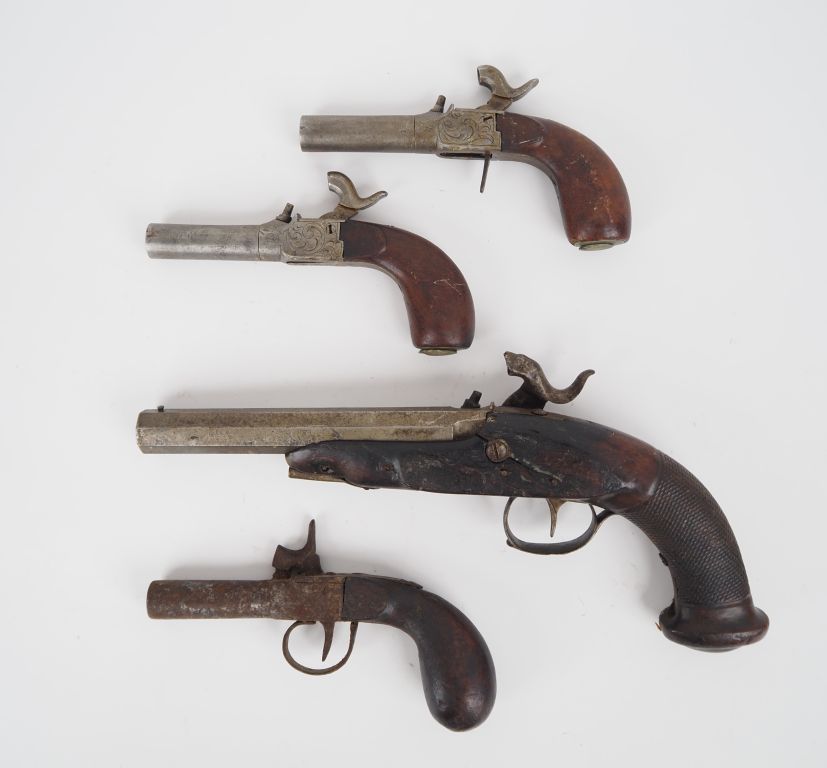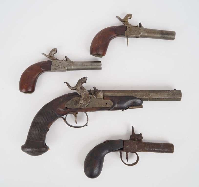 Ensemble comprenant : Une paire de pistolets à coffre à percussion. Fabrication Liégeoise. Calottes ouvrantes. E.M. (Accidents mécaniques). On y joint un pistolet à coffre dans l’état (Piqûres et accident mécanique) et un pistolet d’officier à percussion accidenté vers 1840.