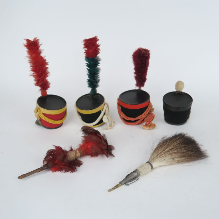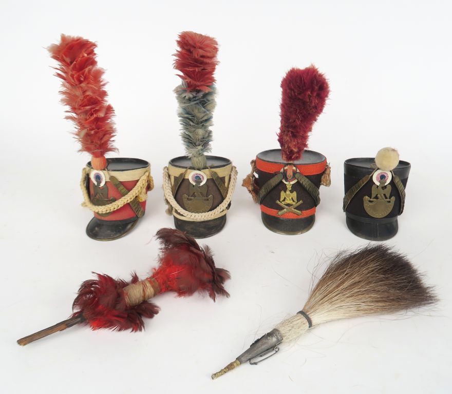Ensemble de quatre coiffures miniatures dans le gout de Sandre en drap, passementerie, laiton et cuir. -Shako de garde d’honneur, avec plumet. -Shako d’artillerie. Avec plumet -Deux shakos d’infanterie avec plumet. Ht : 65 mm. Sans plumet. A.B.E. XXe siècle.