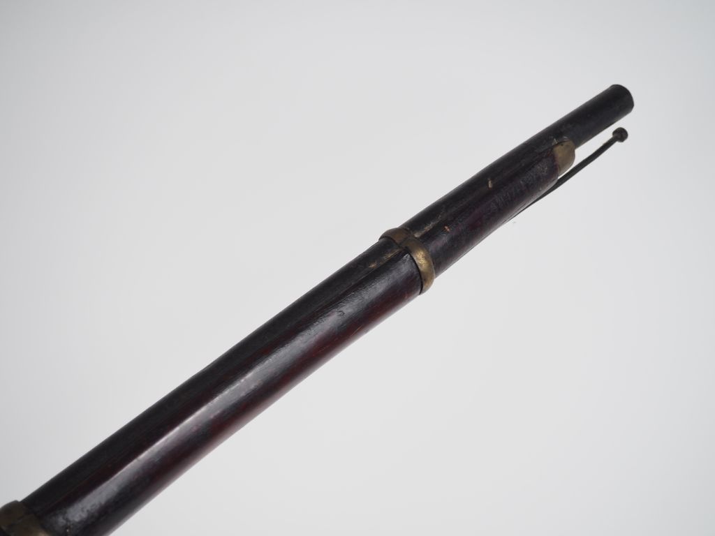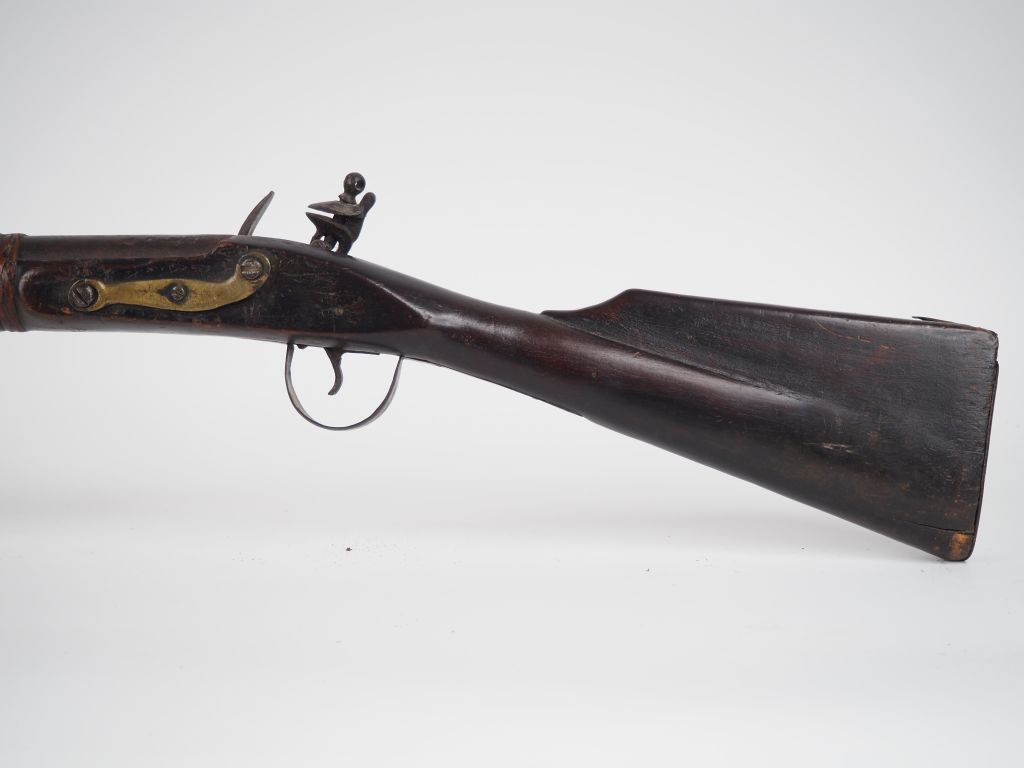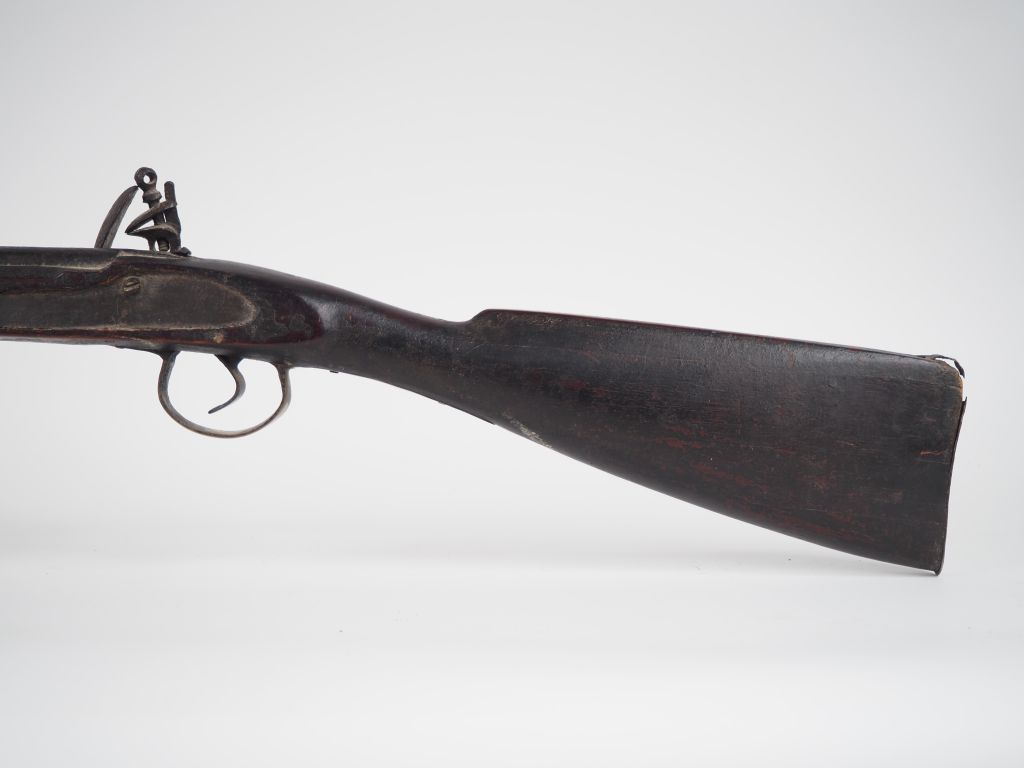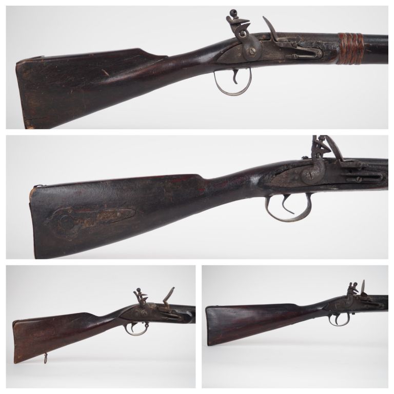 Ensemble de quatre fusils à silex dit « de traite » pour la décoration. Garnitures en cuivre, laiton, ligatures végétales. Crosses en noyer. E.M.