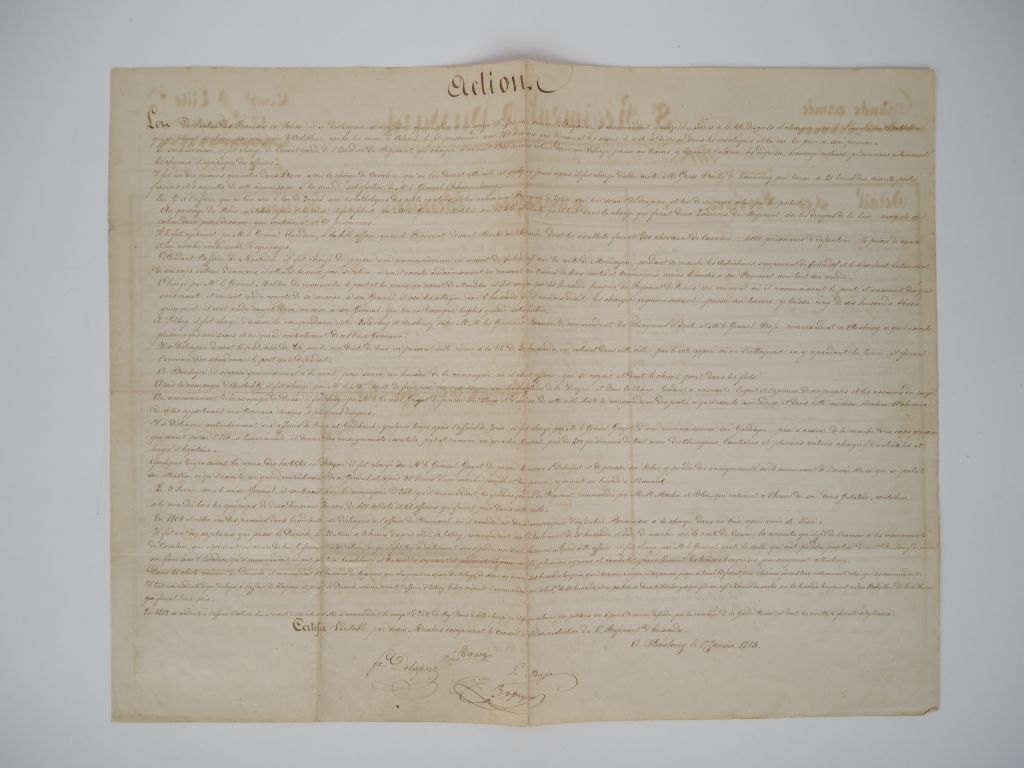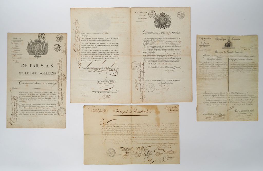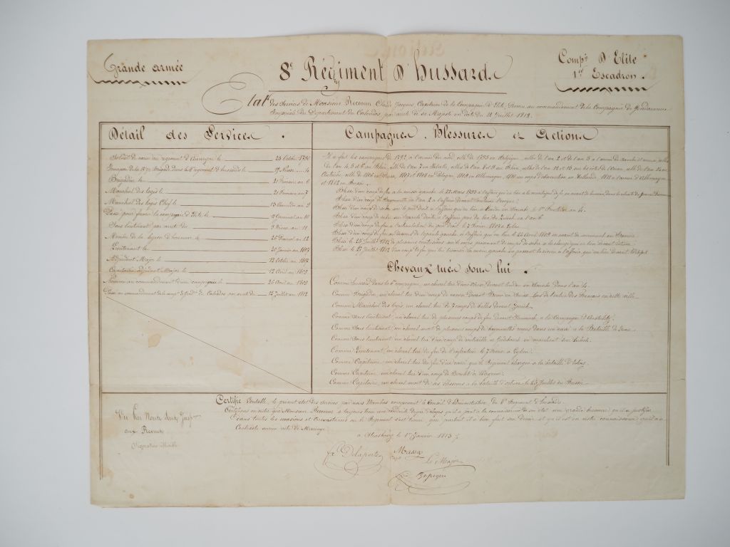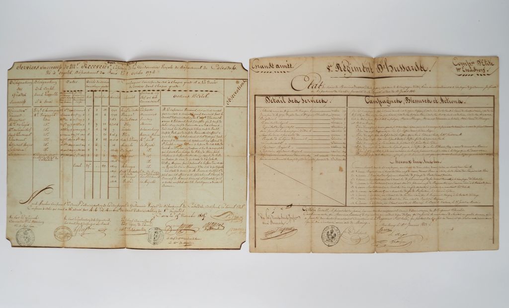 Ensemble de sept documents comprenant : Documents sur le Capitaine Jacques Claude RECEVEUR -Brevet de Sous-lieutenant. Neuf nivôse AN 11. Signatures de Bonaparte (Secrétaire), d’Alexandre Berthier et d’Hugues Maret. -Certificat de bonne conduite au 8e Hussards. Sur papier toilé. Signatures des officiers et du colonel du Coetlosquet. Le 1 avril 1813. -Grands états de service du 1er janvier 1813 sur papier toilé. Avec copie manuscrite d’époque. -Etats de services du 15 novembre 1815. -Deux commissions de garde forestier de SAS Mgr le Duc d’Orléans. Au nom de Louis ARNOULT pour la forêt d’Orléans. (1816 et 1829). Biographie Jacques Claude RECEVEUR (1774-1849) Officier du 8e régiment de hussards, officier de la Légion d’honneur. Capitaine de la Gendarmerie royale sous la Restauration.