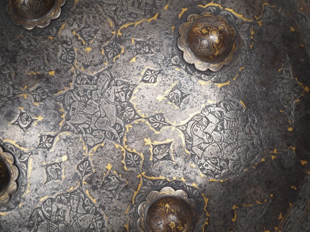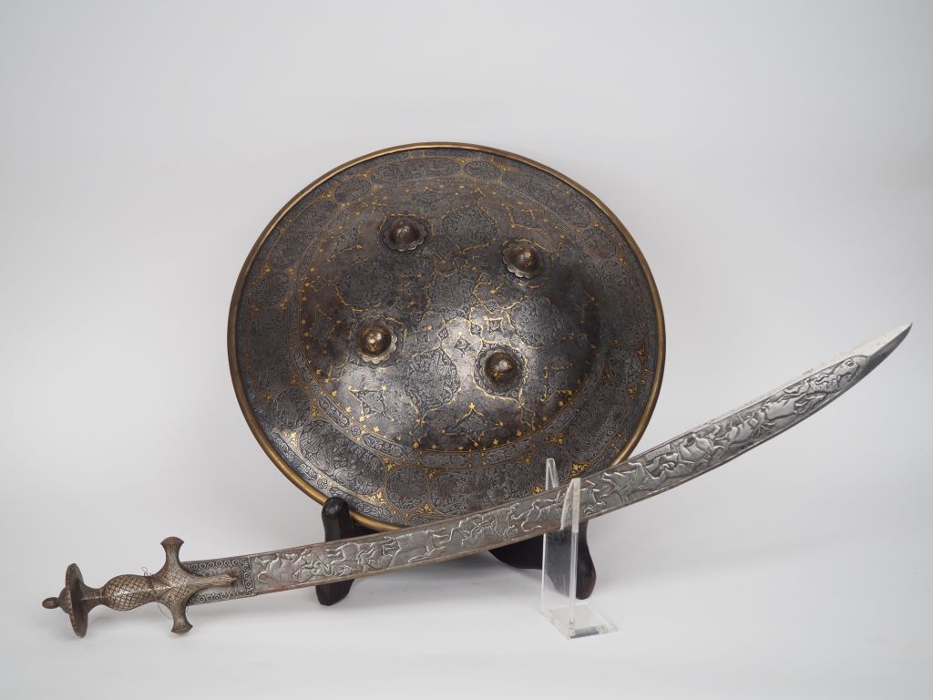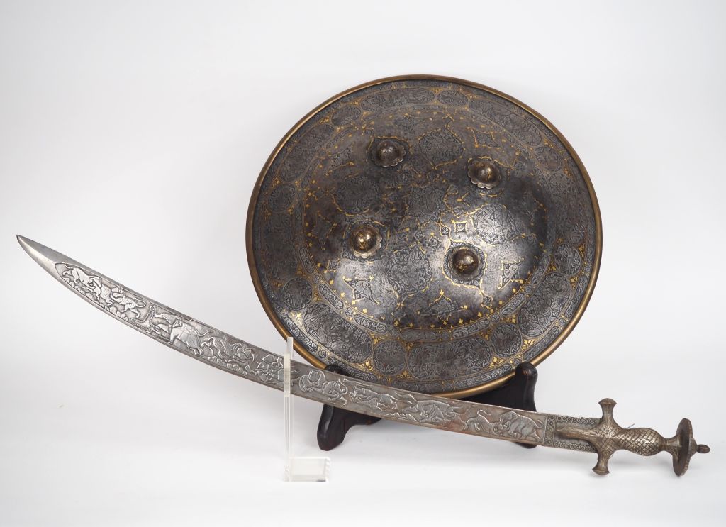 Ensemble indo-persan comprenant : -Une rondache en fer forgé, à quatre bossettes. Jonc en laiton. Entièrement gravé de frises feuillagées de médaillons à décor d’animaux et personnages, rehaussé à l’or. Diam : 45 cm. -Sabre Talwar. Monture en fer, garde à deux quillons et demi-oreillons décorés à l’argent d’un semis de fleurettes. Lame à dos plat entièrement gravé d’une frise d’animaux et de personnages sur les deux faces. Longueur : 84 cm.