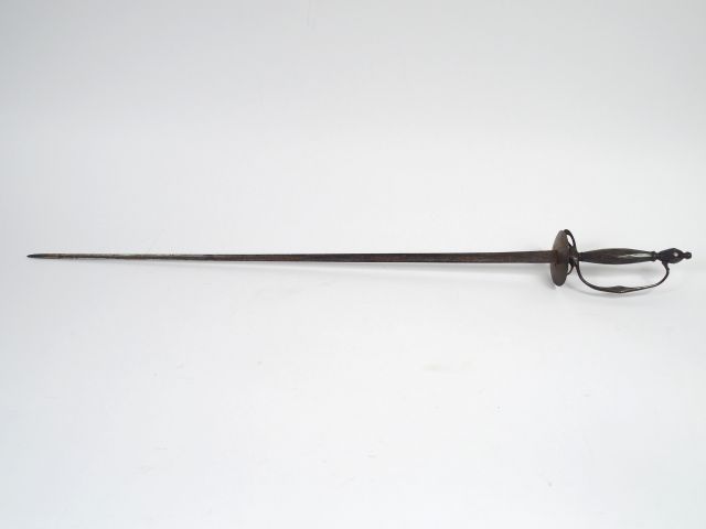Epée de cour Française montée fer fin de l’ancien régime, lame triangulaire à pan creux de 690mm de long, traces de trophées d’arme gravés au trait. Pas d’âne figuratif, plateau de garde rond et lisse, fusée en tôle de fer en forme de navette à facettes, pommeau en urne à facette et à bouton de rivure proéminent. Pas de fourreau.2+