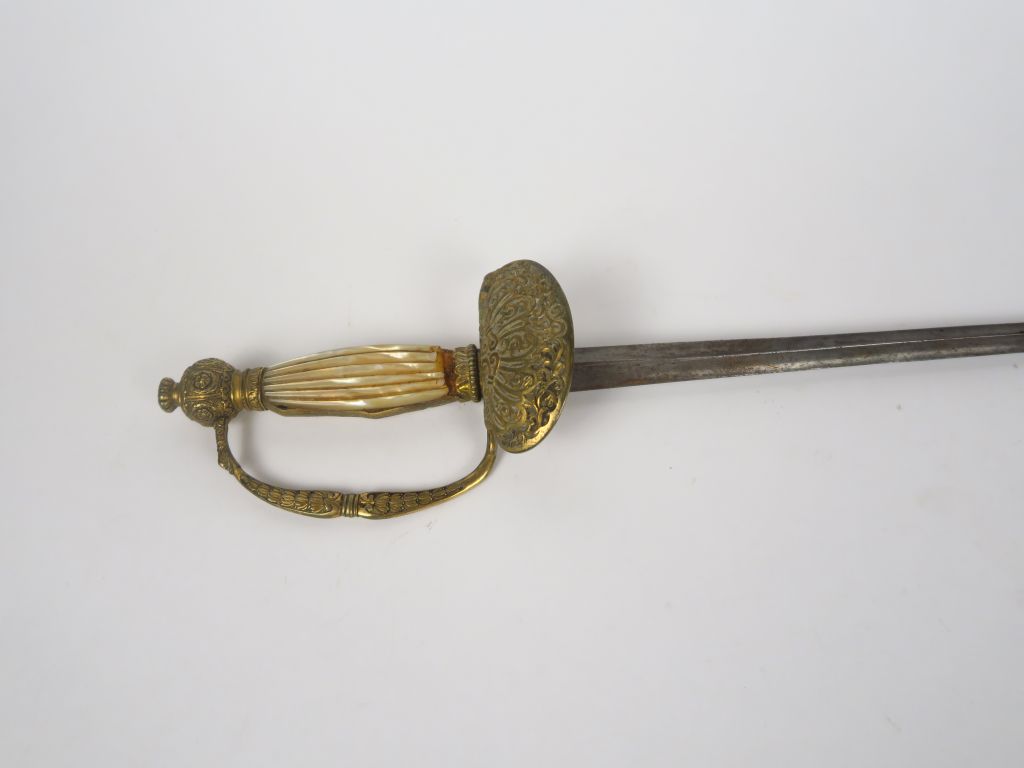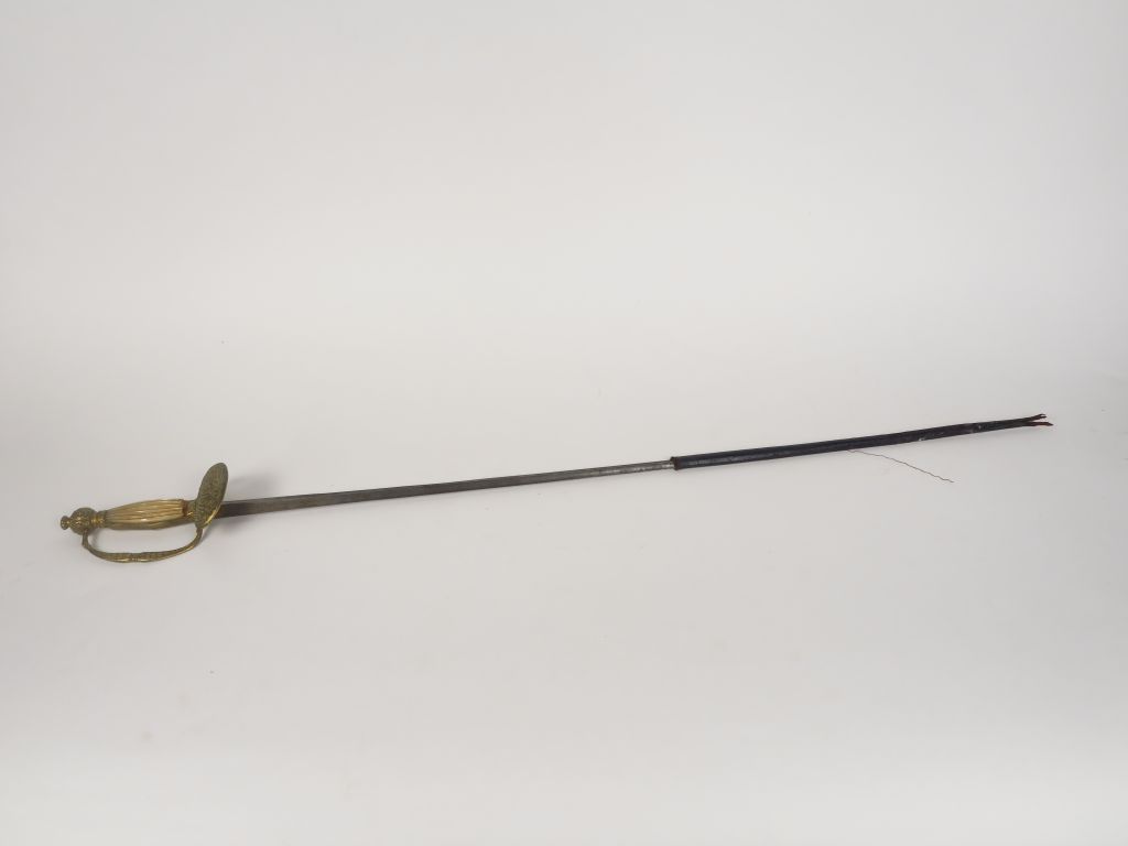 Epée de cour monture en bronze doré ciselé, plateau de garde à décor de volutes, pommeau rond, bouton de rivure prohéminent, lame triangulaire à pans creux, reste de cuir de fourreau. (Etat 3)