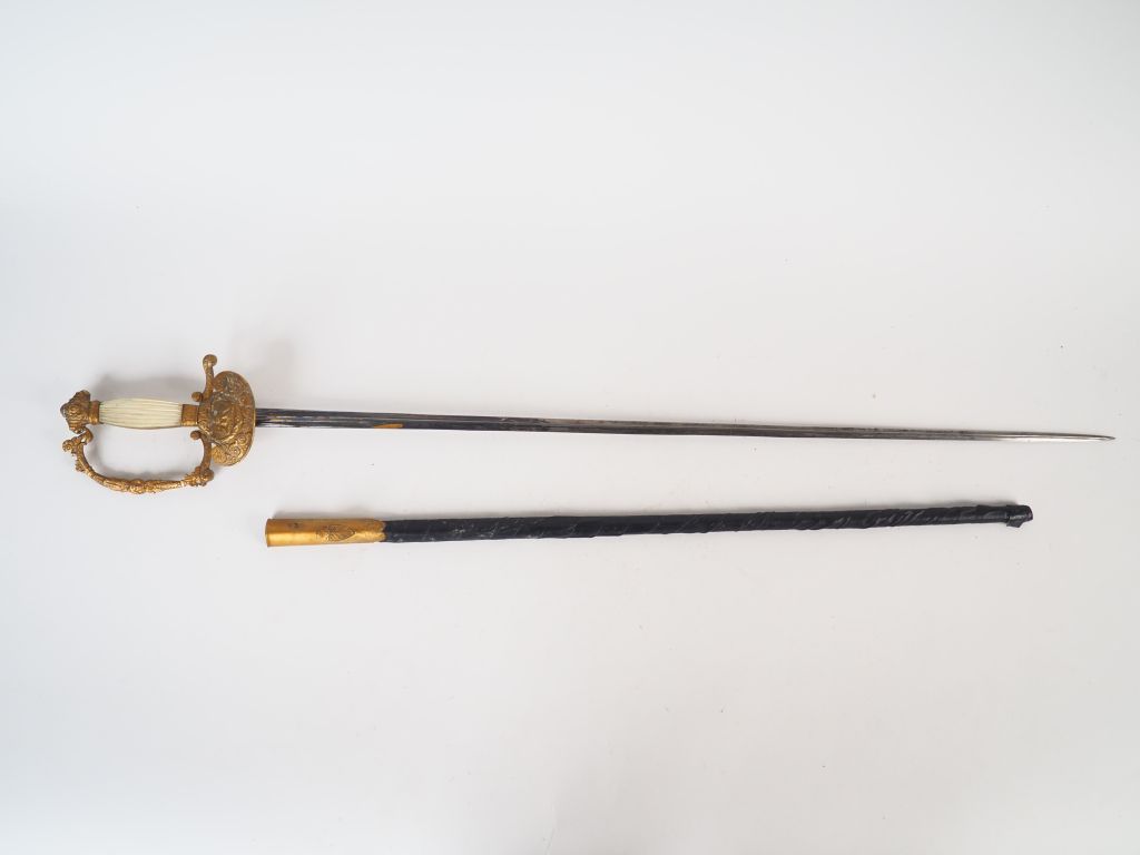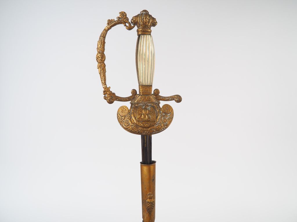 Epée de fonctionnaire impérial époque Napoléon III, lame triangulaire à trois pans creux incisée, dorée et bleuie (restes). Monture en bronze doré richement ciselé. Pommeau quadrilobé ,branche de garde ciselée de feuillages, plateau de garde en lyre à terminaison en volute, cartouche central à l’aigle impériale non couronnée sénestrogyre. Avec un fourreau cuir réparé avec de la guidoline chape à crochet, pas de bouterolle. (Etat 2-)