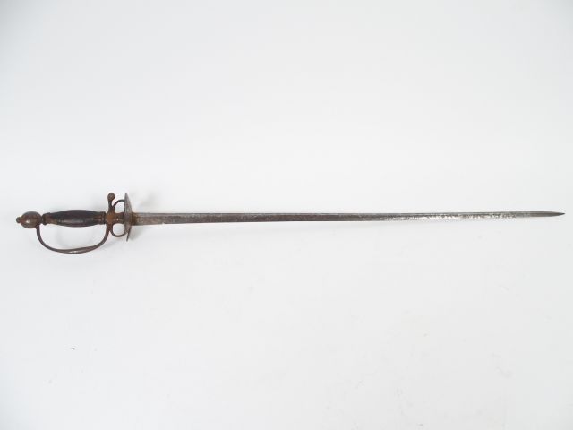 Epée de sergent modèle 1767, lame triangulaire à pans creux de 670mm de long (raccourcie) signée en cursive à la pointe dans les creux: “Guyon l’ainé au Roy de la Chine “ ”sur le pont St Michel à Paris” sur les trois faces de la lame. Epée montée fer, doublé pas d’âne fonctionnel, pommeau en olive, doublé pontât plein surligné d’un trait, fusée bois sombre. Pas de fourreau. 2.