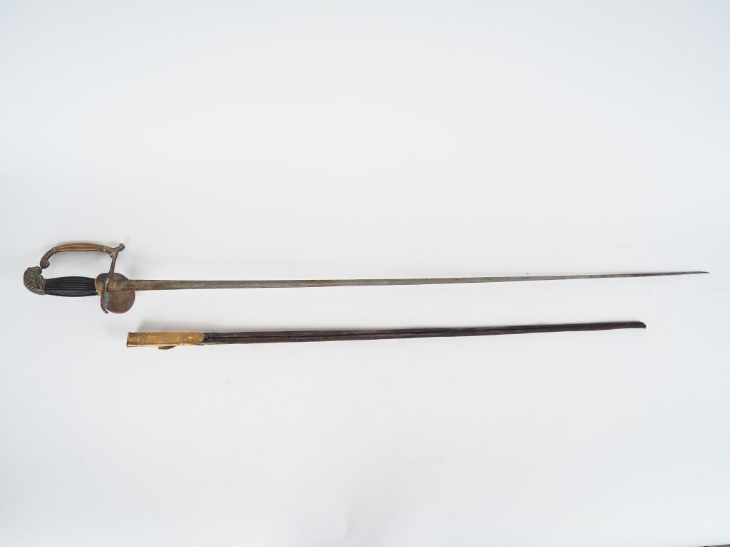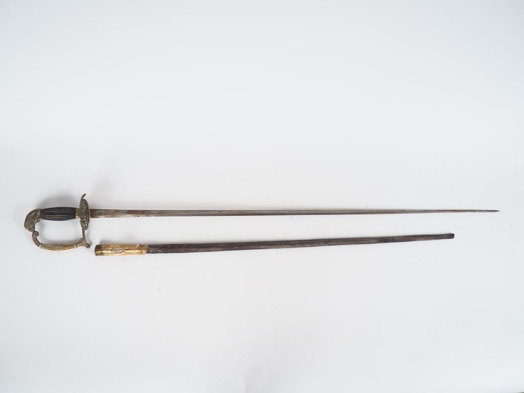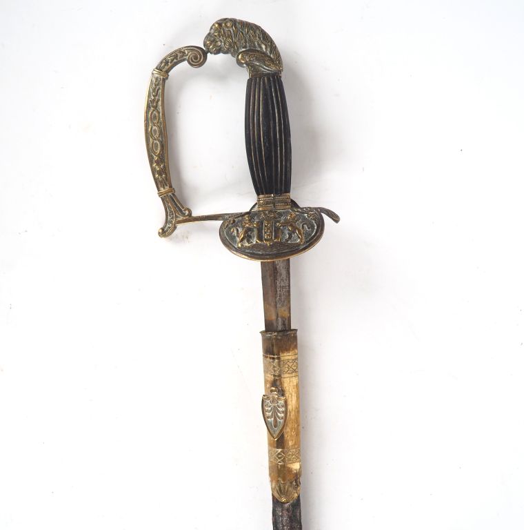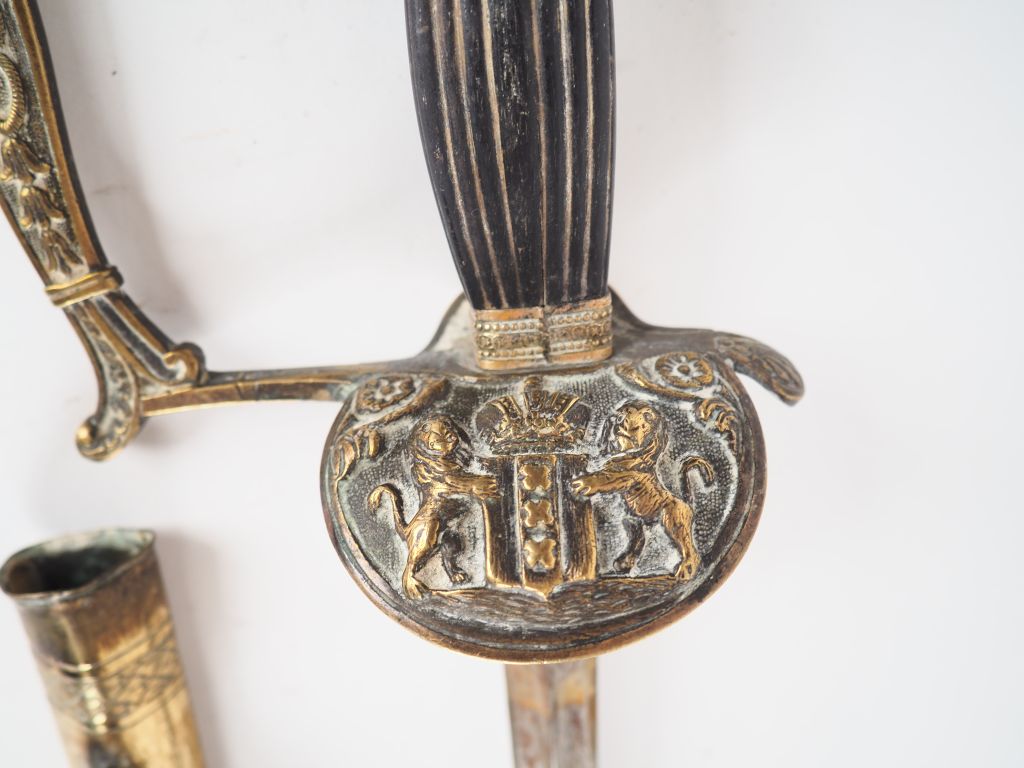 Epée de société, lame triangulaire à trois pans creux pas de marquages visibles, Monture en bronze doré ciselé, pommeau zoomorphe en tête de lion en crosse. Branche de garde unique joignant le plateau à angle droit, quillon en palmette, plateau principal portant en relief deux lions affrontés appuyés sur un pilastre couronné (Armoiries ancienne du royaume Batave), contre garde arquée vers la fusée. Fusée en corne striée en long, dans son fourreau cuir avec chape à crochet. Pas de bouterolle. (Etat 2)
