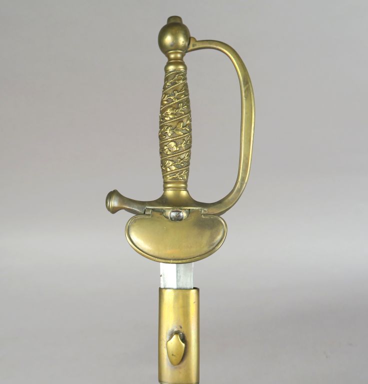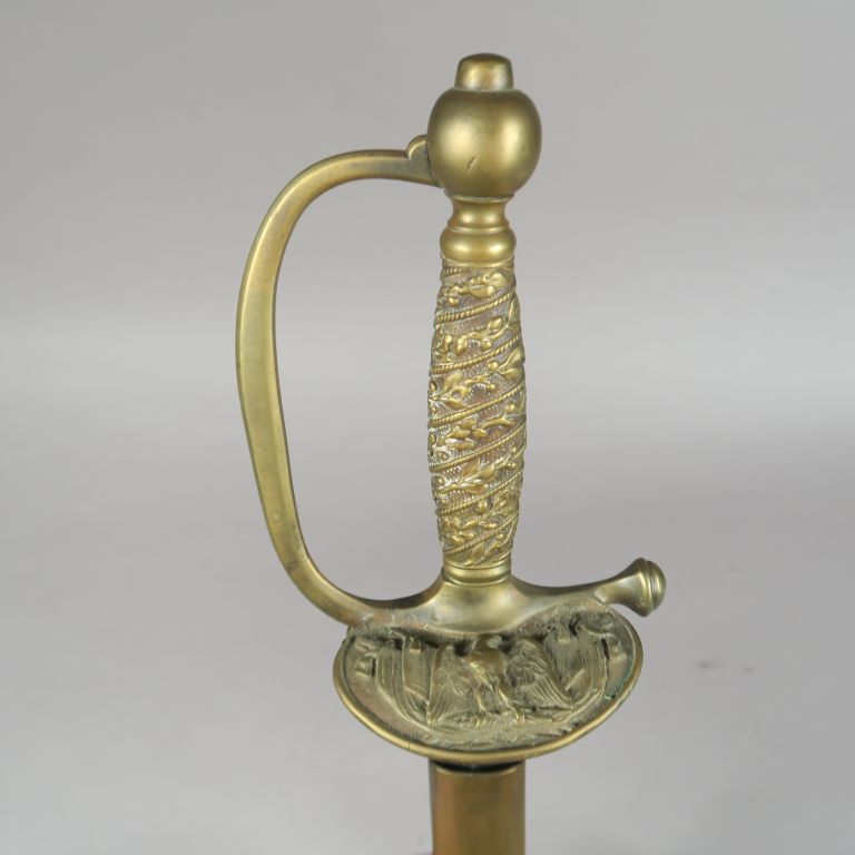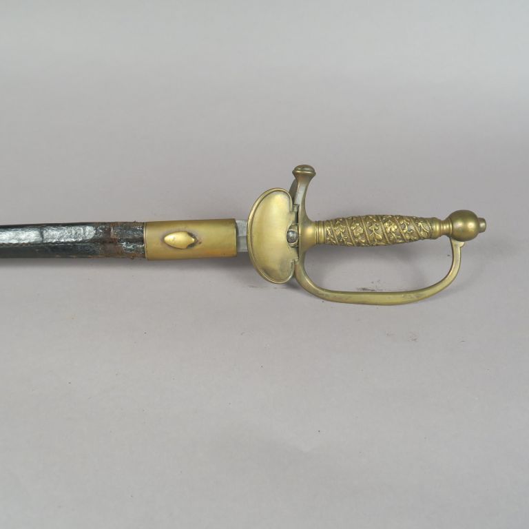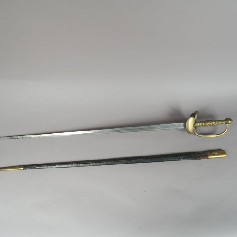 Épée de sous-officier de gendarmerie modèle 1853 Fusée à décor de frises de lauriers. Monture en laiton, garde à une branche, clavier à l’Aigle sur faisceau de 4 drapeaux. Contre clavier à pompe (accident). Lame à arête médiane. Fourreau en cuir rétréci, à deux garnitures en laiton. A.B.E. Époque Second Empire.