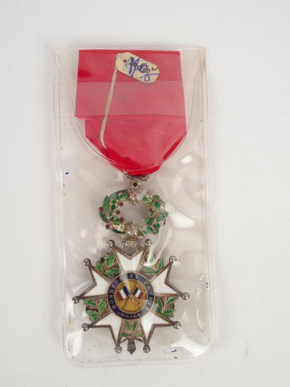 Etoile de chevalier de la légion d'honneur Troisième République à l'ordonnance du 8 Novembre 1870.Version de luxe bombée, Avers, centre or fond strié, tête de Marianne et texte "REPUBLIQUE FRANCAISE 1870" sur fond émaillé bleu,(manque) revers drapeaux tricolores croisés sur centre or et texte sur fond bleu "HONNEUR ET PATRIE", couronne de laurier argent émaillée et articulée épaisse. Avec son ruban.