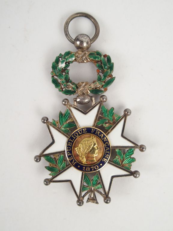 Etoile de chevalier de la légion d'honneur Troisième République (Demi-taille) à l'ordonnance du 8 Novembre 1870. Avers, centre or fond strié, tête de Marianne et texte "REPUBLIQUE FRANCAISE 1870" sur fond émaillé bleu, revers drapeaux tricolores croisés sur centre or et texte sur fond bleu "HONNEUR ET PATRIE", couronne de laurier argent émaillée et articulée. Sans ruban.