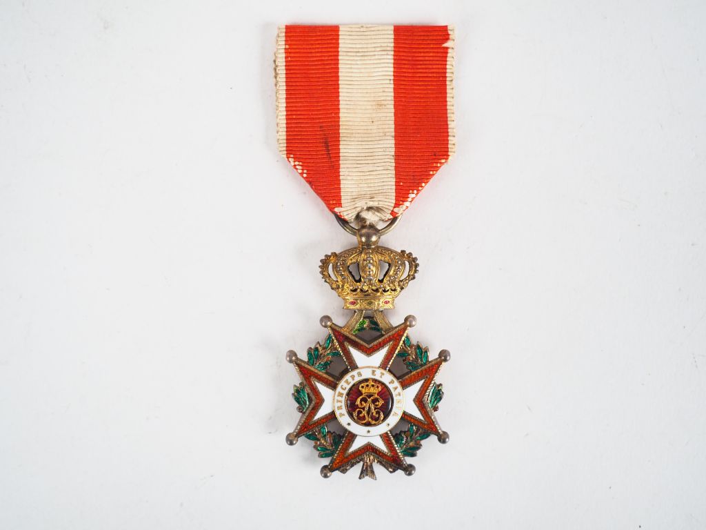 Etoile de chevalier de l’ordre monégasque de St Charles. Etoile en bronze doré et émail, revers aux armes de la principauté avec son ruban rouge, blanc, rouge. (Etat 1)