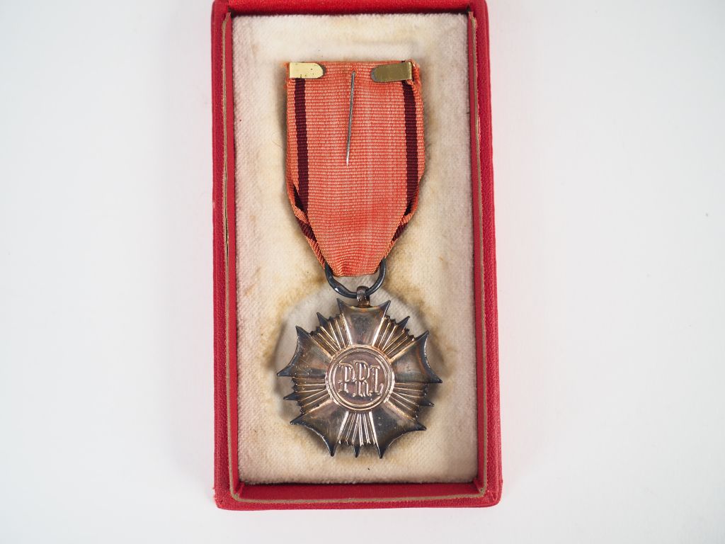 Etoile de l’ordre polonais du drapeau du travail (1949), dans sa boite d’origine avec son ruban rouge. (Etat 1-)