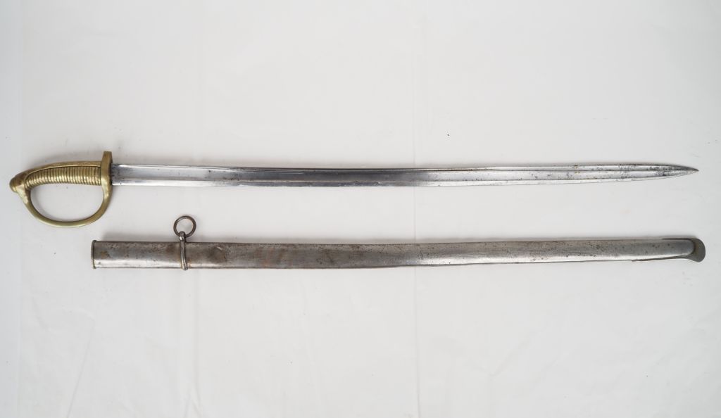 Étonnant sabre briquet modifié type 1855. Monture en bronze, garde à une branche et quillon supprimé. Lame cintrée à pans creux et gouttière d’officier d’infanterie 1855, datée de Châtellerault « Xbre 1865 ». Fourreau en tôle de fer à un bracelet. E.M. (Piqûres)
