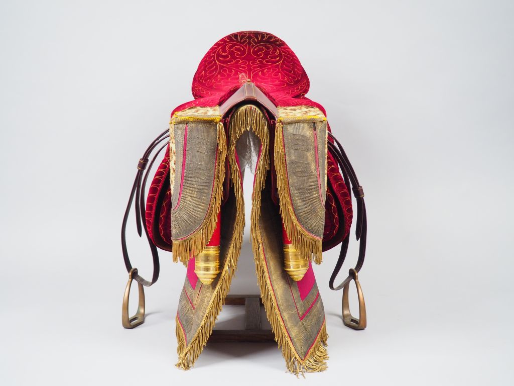 Exceptionnelle selle d’officier supérieur d’achat privé de qualité exceptionnelle, tapis de selle rouge ponceau à large double galon en passementerie dorée et franges de canetille d’or belle paire de fontes cuir à culot laiton doré et couvre-fontes habillée de peau de panthère et large galonnage double froncé en passementerie dorée sur canapé rouge insolé, des franges dorées en canetille surlignent les rabats des couvre-fontes. La selle habillée de velours cramoisi est rehaussée d’un décor cousu en fils dorés. Etat 1