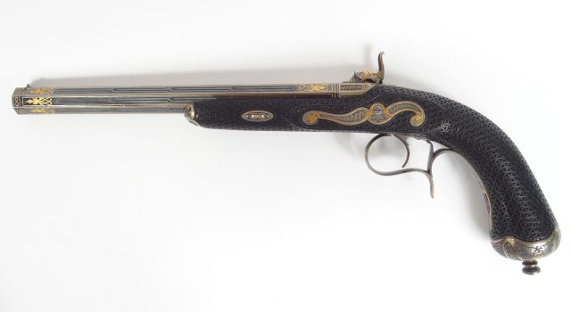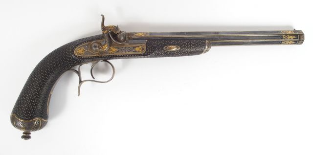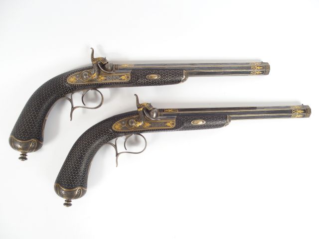 Extraordinaire paire de pistolets à percussion présentés dans leur compartiment avec tous leurs accessoires. (Ce compartiment était l’étage inférieur d’une grande boite, le compartiment supérieur contenant un grand révolver, le coffret à été hélas scindé en deux lors d’un partage d’héritage, selon la tradition familiale le coffret aurait été signé par « Lainé Arquebusier 21 rue de Rivoli à Paris » qui était un ancêtre des actuels propriétaires (arrière grand oncle) ) Ces pistolets d’une qualité remarquable sont montés avec des platines à l’avant, toutes les garnitures sont en acier incrusté d’un filigrane d’or et traité à la trempe grise. Les canons rayés octogonaux montés à tiroir ont vu tous leurs flancs surlignés d’un fil d’or et gravés d’un discret entrelacs de traits parallèles. Le bronzage noir bleuté profond des canons est absolument intact, la monture est en ébène, intégralement recouverte d’une quadrille réalisée au ciseau en dégageant de manière régulière des espaces triangulaires en fonds descendus et groupés par 5 le tout entourés d’un champ polygonal. La calotte enveloppe le fond de crosse et remonte assez haut. Clou de calotte proéminent, pontet à repose doigt, capuche ronde à l’avant du fut, contre platine en volute double contrariée. Le plateau sur lequel sont présentés à la Française ces pistolet est habillé de velours cramoisi, insolé sur les faces visibles, le cramoisi ayant viré au jaune. Le plateau présente aussi un moule à balle ronde simple cavité massif en acier superbement réalisé et nanti d’un coupe jet automatique, un maillet de chargement en palissandre, une baguette de chargement et une baguette de nettoyage les deux en ébène. Deux compartiments triangulaires forment réservoir de balle et d’amorces sur les flancs opposés du plateau. Très bel ensemble intact typique des productions de très haute qualité du second empire. 1+