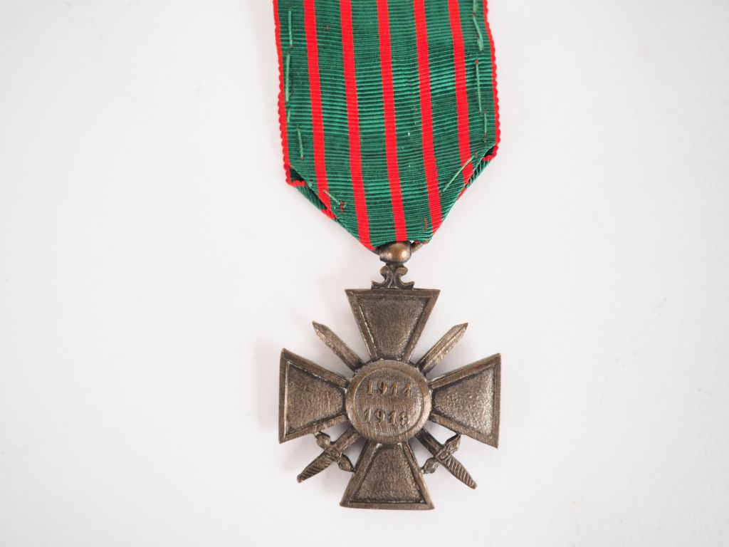FRANCE Croix de guerre 1914-1918. En bronze argenté, de fonte frustre. Ruban de collectionneur à dix-neuf palmes et une étoile dorée.