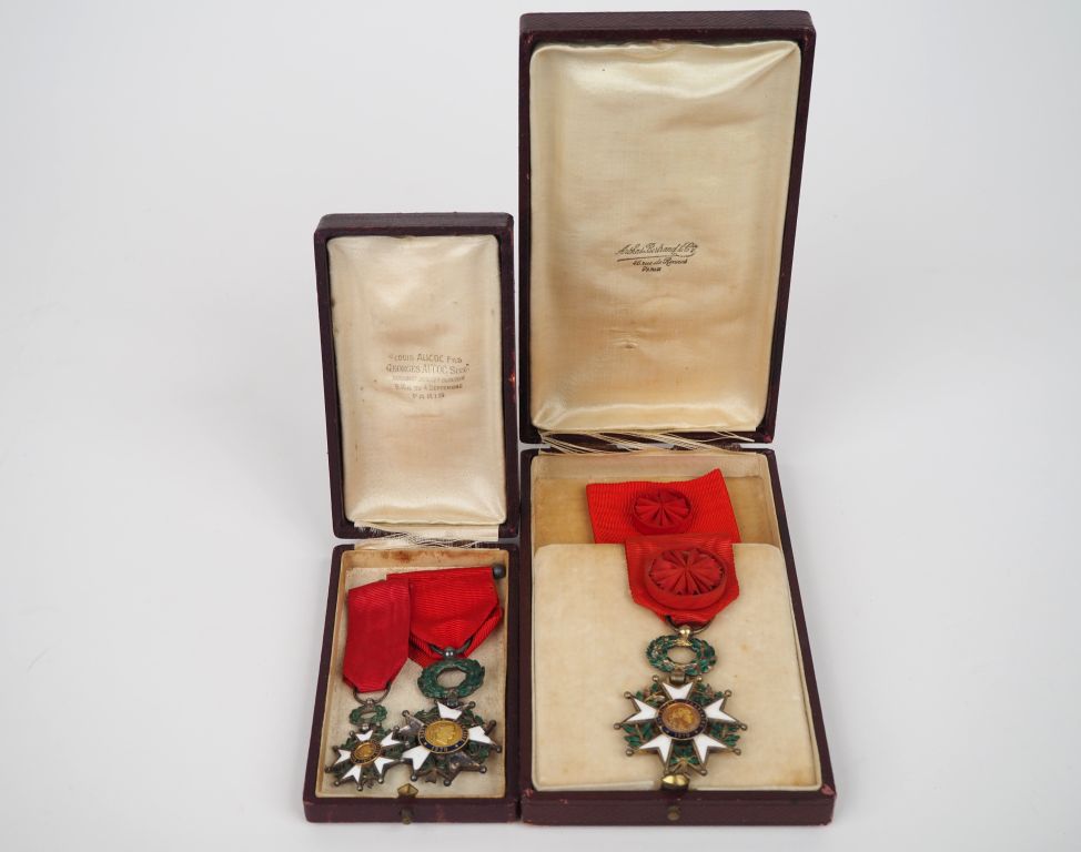 FRANCE ORDRE DE LA LEGION D’HONNEUR Etoile d’officier d’époque IIIe République, à filets. Vermeil et émail T.B. Dans un écrin d’Arthus Bertrand On y joint une étoile de chevalier IIIe République et sa réduction, en argent, or et émail. B.