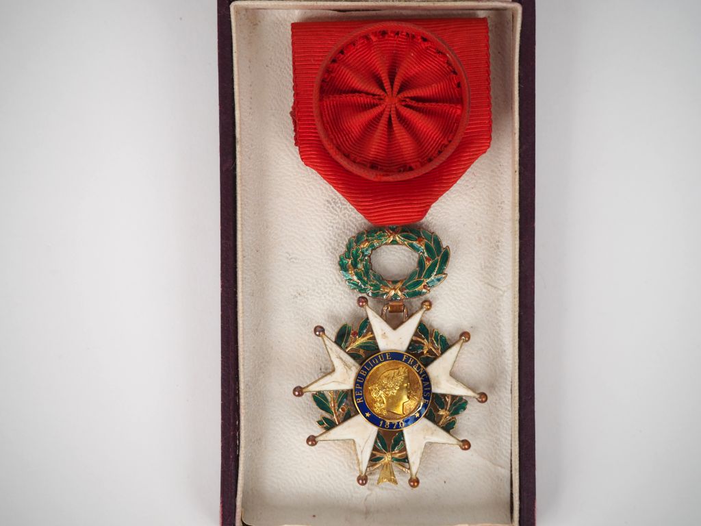 FRANCE ORDRE DE LA LEGION D’HONNEUR Etoile d’officier d’époque IIIe République. Or et émail (éclats). Ruban à rosette. Poinçon tête d’aigle 56 x 39 mm. Poids brut : 13,5 g T.B. Dans son écrin d’officier de la Maison Aucoc.