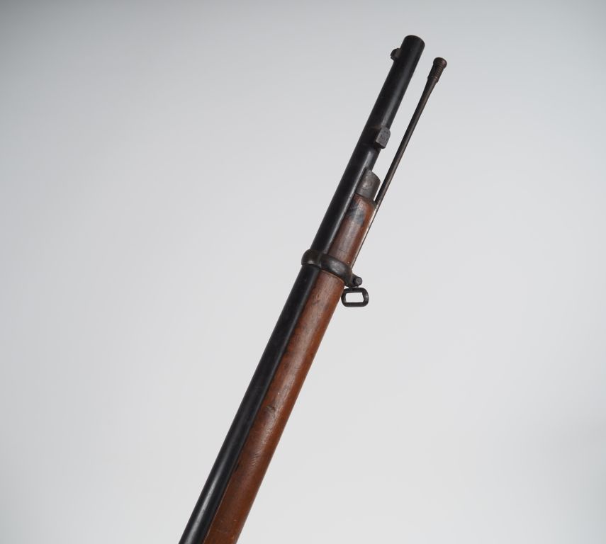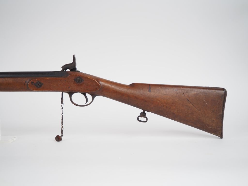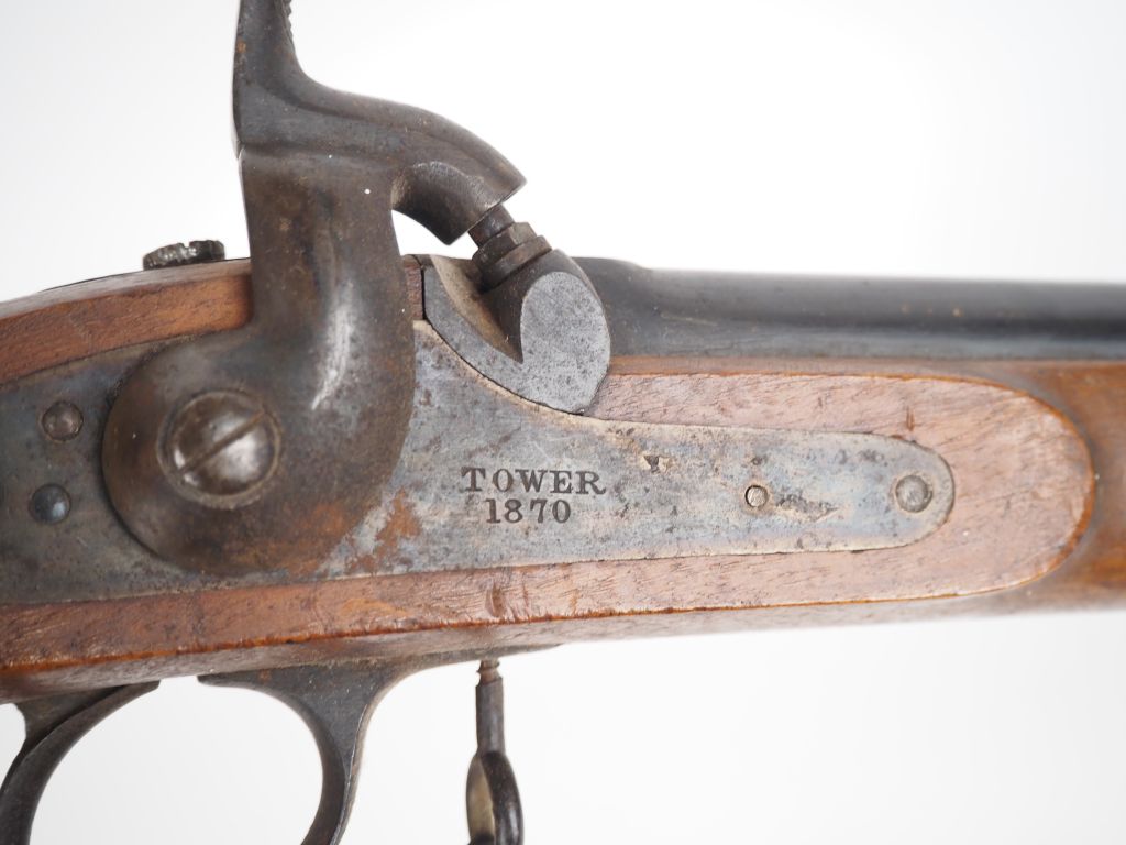 Fusil à percussion britannique Tower. Canon rond avec hausse graduée à 10. Platine a corps plat frappée « TOWER 1870 » et chien à corps rond. Garnitures en fer uni. Finition bronzée patinée. Baguette en fer. Longueur : 123 cm. A.B.E.