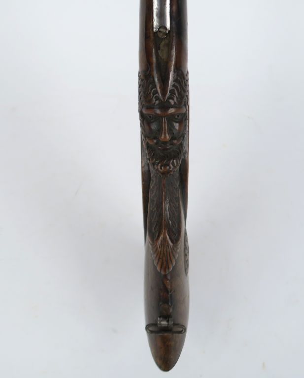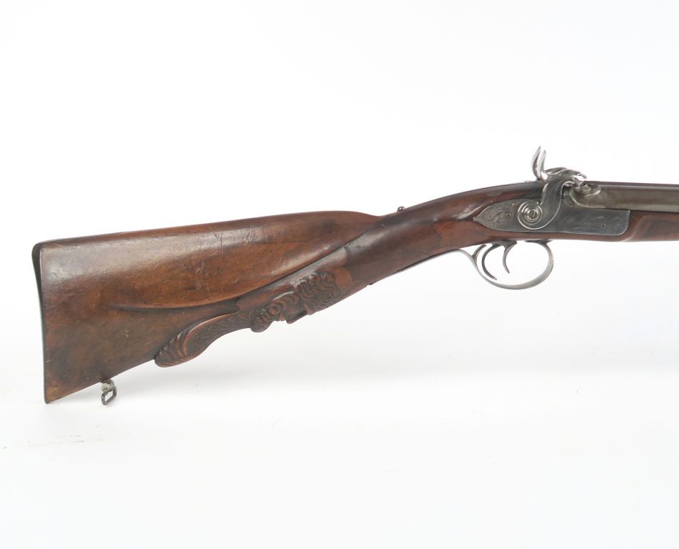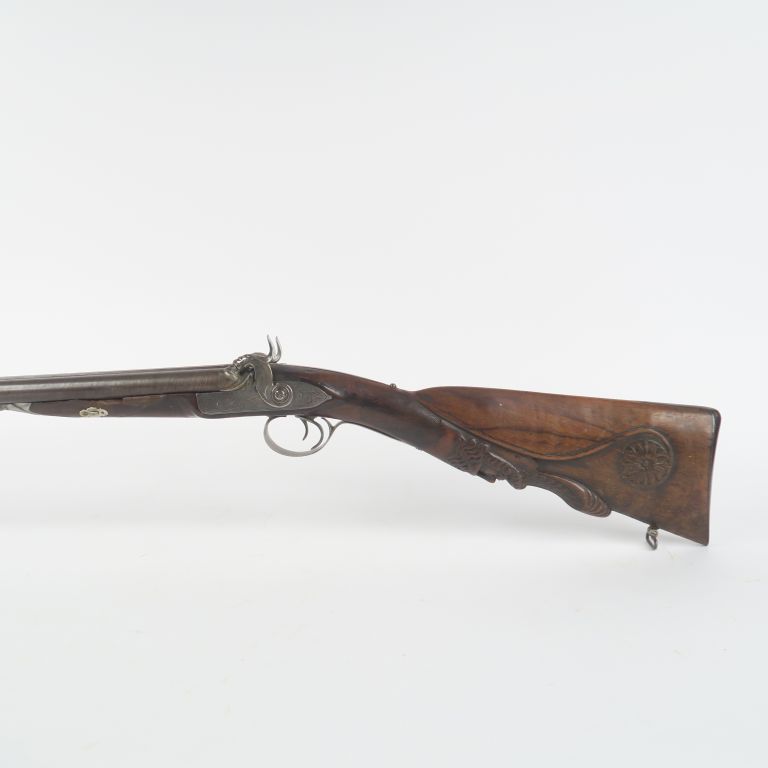 Fusil à percussion deux coups. Canons en table ruban damas. Platines avants signées « BALAGNA à BAGNERES » et garnitures en fer gravé. Crosse sculptée d’une tête d’homme barbu et d’une rosace. Longueur : 125 cm. A.B.E. (Accidents à l’avant du fut, manque la queue de pontet)