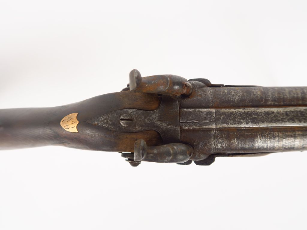 Fusil de chasse juxtaposé à percussion et platine à l'avant, arme avec crosse noyer "bec de canard" joue à volute, pièce de pouce en forme d'écu à la Française. Arme à restaurer, sans baguette, mécanisme à revoir. Catégorie "D" (3+)