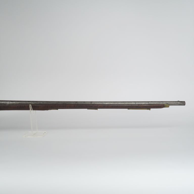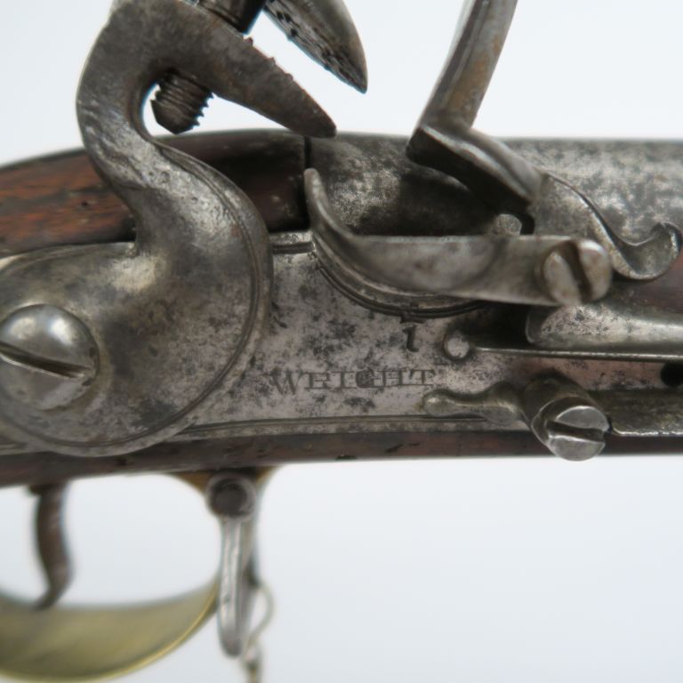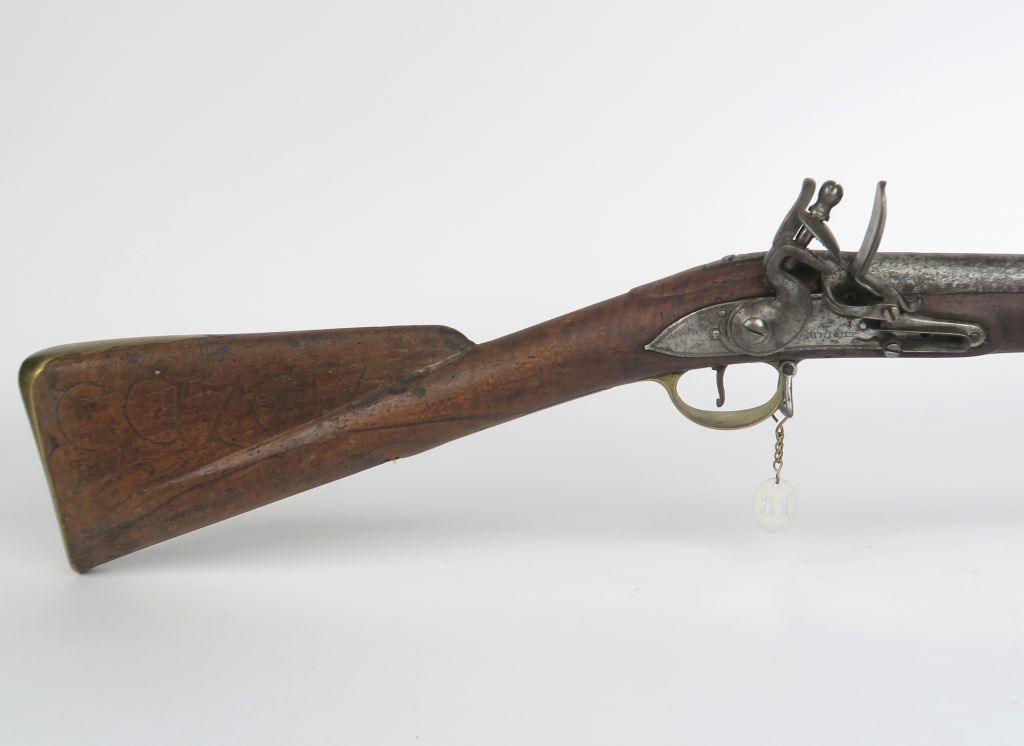 Fusil d’infanterie à silex, britannique. Canon rond. Platine signée « WRIGHT » et chien à corps rond décoré au trait. Garnitures en laiton. Crosse en noyer avec traves d’un marquage « CAZA... » . Manque la baguette. Longueur : 131 cm E.M. Trous d’insecte et restaurations de bois.