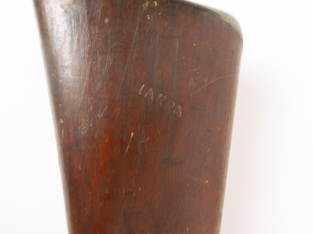Fusil réglementaire Espagnol à silex, chien à la française à espalet avec "patilla" (pied faisant office de cran de gâchette) , platine à corps plat, bassinet laiton, toutes garnitures laiton arme de 1510 mm de long, long canon acier de 111 mm de long, un des pans de l'octogone au départ du canon porte la date 1806, marquage sur la monture en noyer au niveau du flanc du pied de vache de la crosse "LARRA". Mécanisme fonctionnel, manque la baguette! Arme de catégorie "D". (1)