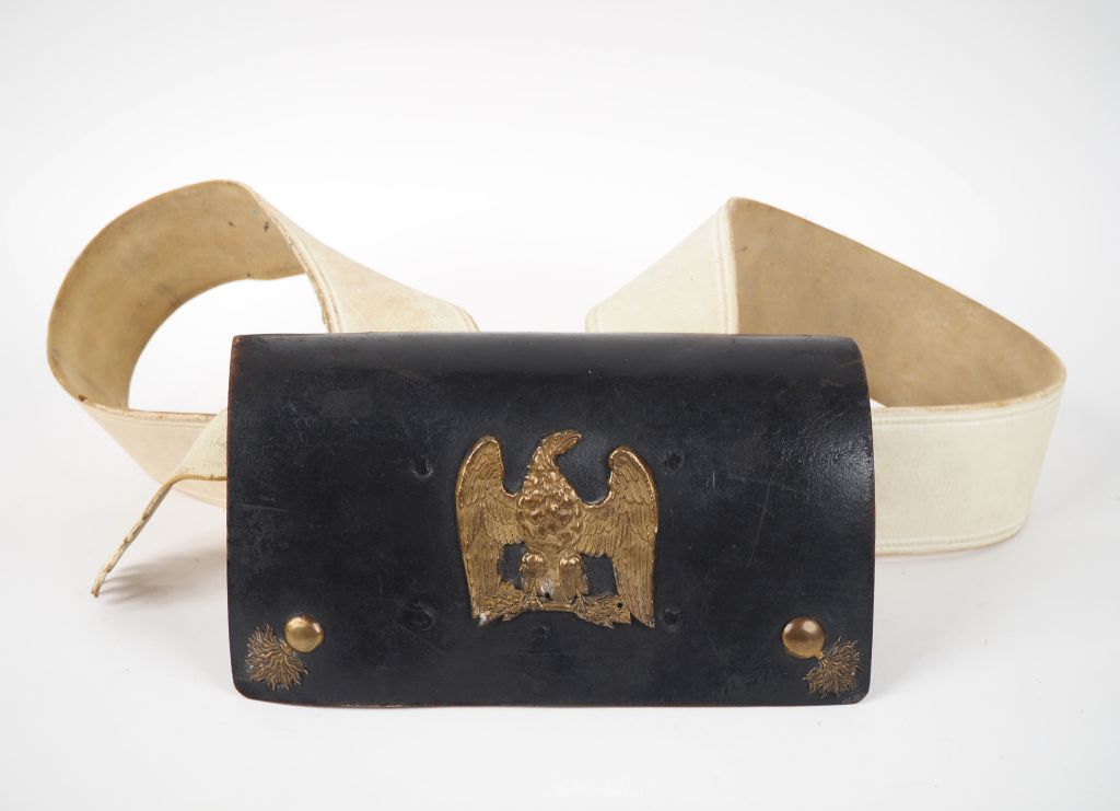 Giberne d’infanterie. Coffret en cuir noir à âme en bois à 5 emplacements, orné en façade d’une petite poche en basane fermant par un bouton en cuir roulé. Pattelette en cuir à motif à l’aigle et deux motifs à la grenade aux coins inférieurs (traces de l’emplacement d’un ancien motif central) Attache de pattelette déchirée mais complète. Martingale en buffle blanchi découpé en forme de grenade (du type des grenadiers à pied de la Garde). Banderole en buffle blanchi non surpiquée avec attaches à boucletons en laiton (emplacements modifiés à l’époque). A.B.E. 1ère partie du XIXe siècle pour la giberne, motifs de pattelette changés postérieurement. Coffret : 22 x 10 x 6 cm.