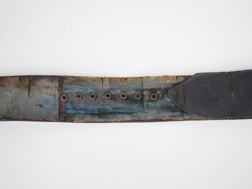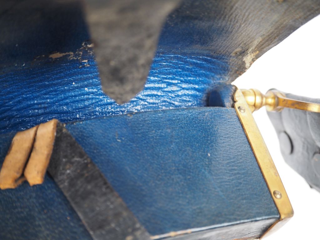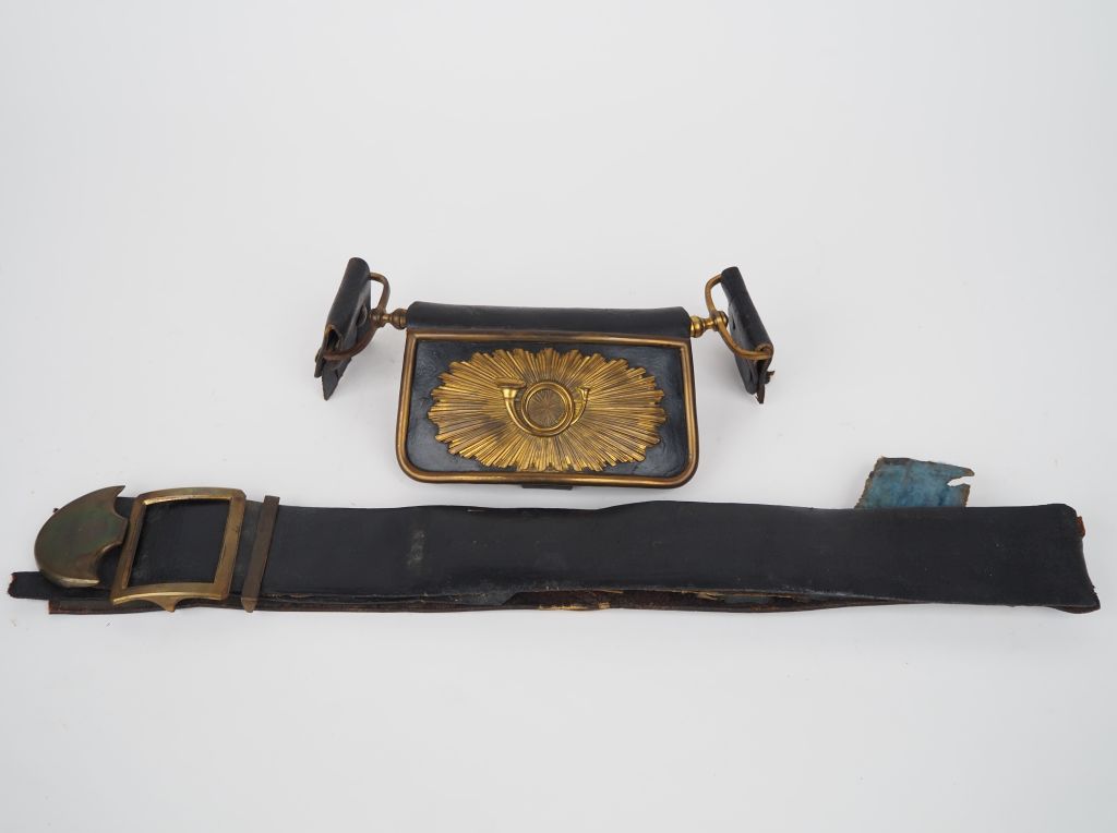 Giberne d’officier de chasseurs à cheval modèle 1872. Coffret à côtés, jonc et motif rayonnant en laiton (restes de dorure). Intérieur doublé de cuir et velours bleu. Présenté avec sa banderole (déchirée) en cuir verni avec restes de doublure en velours bleu et garnitures en laiton doré. A.B.E.