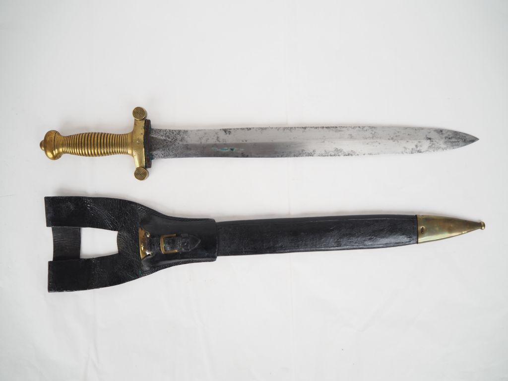 Glaive d’infanterie modèle 1831. Poignée en bronze, à deux quillons droits Lame à arête médiane poinçonnée de « TALABOT » (piqûres). Fourreau en cuir à deux garnitures en laiton (pontet ressoudé) et gousset en cuir verni. A.B.E. Longueur : 66 cm.