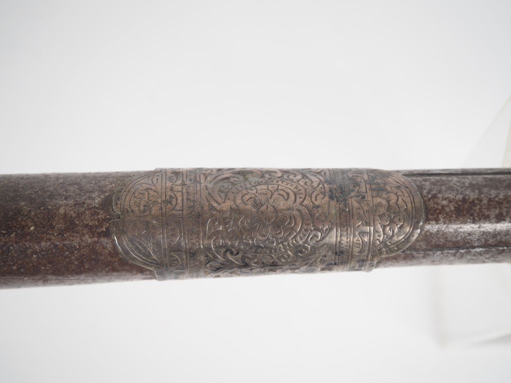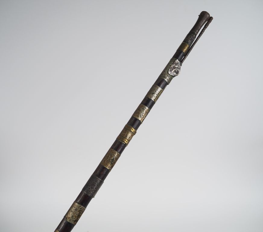 Grand fusil à silex d’Afrique du Nord dit « Moukalah » Canon rond, à pans au tonnerre maintenu par des bagues de laiton et métal argenté. Platine à la Miquelet. Crosse en noyer et os. Dans l’état (Accident mécanique et platine à refixer). Longueur : 161 cm.
