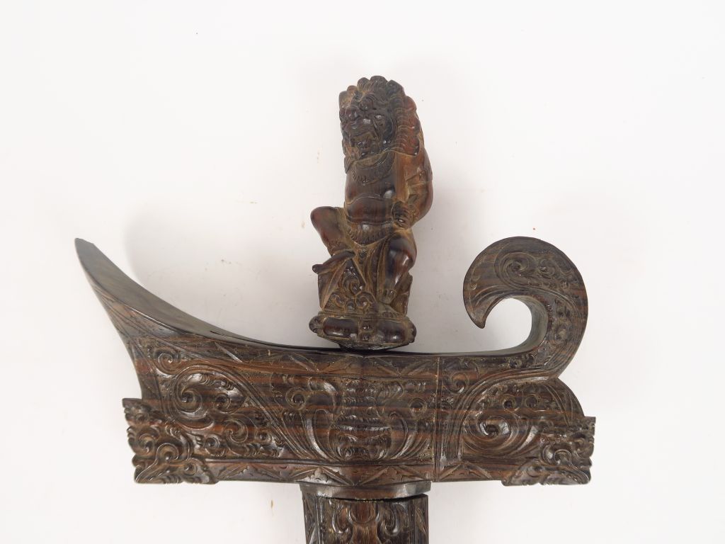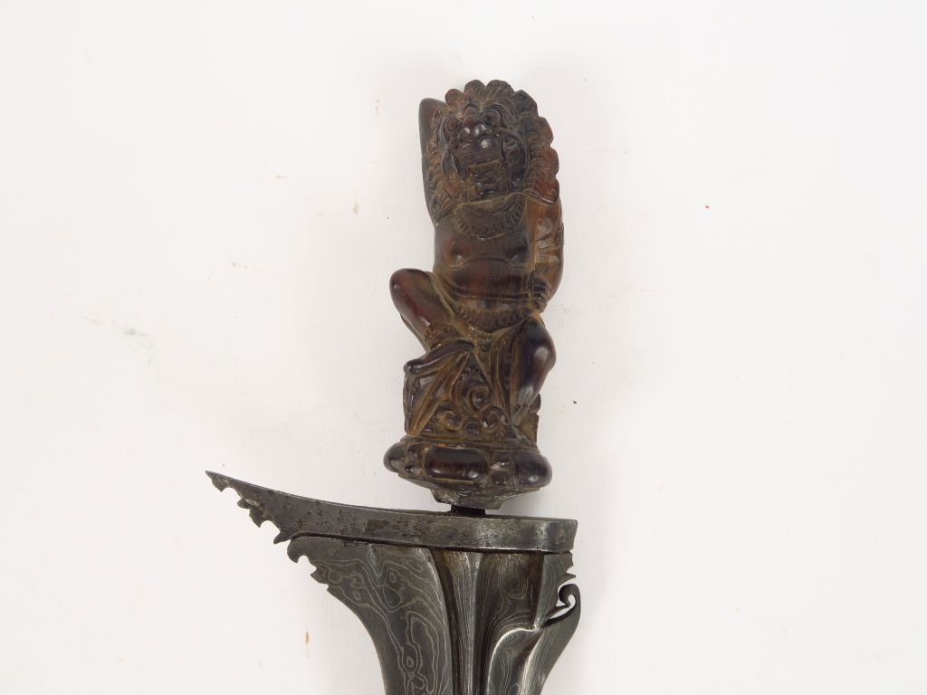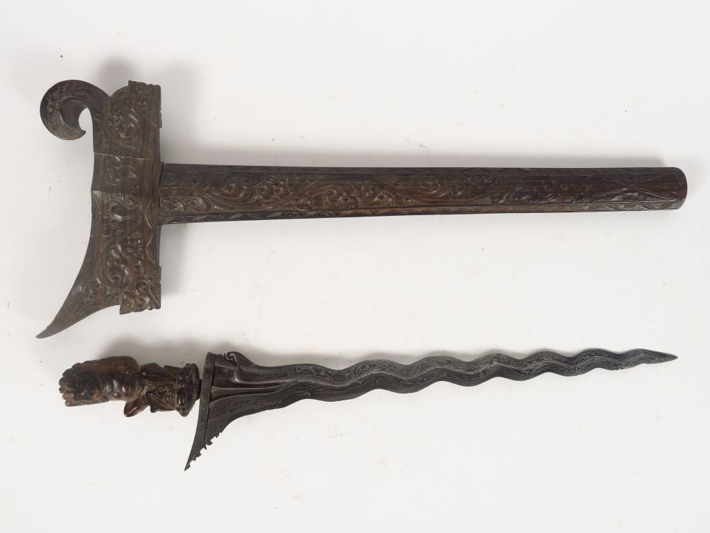 Grand kriss (500 mm de long) très belle lame en pamor blanc et noir à 7 ondulations, arête centrale et pans légèrement concaves. Fusée en bois exotique sculpté, fourreau dans le même bois masques de divinités exotiques et mains griffues et décharnées sur une face, volutes de feuillages à l'avers, belle pièce, travail de qualité soigné. (1)