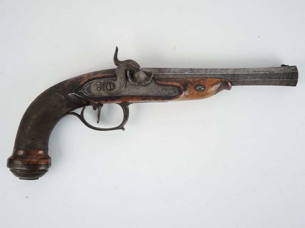 Grand pistolet de tir à percussion et à platine à l’avant signé sur la platine « Lepage à Paris » en belles lettres cursives. Canon à 48 rayures cheveux, octogonal évasé à la bouche. Toutes garnitures fer, pontet demi-Charollais, contre platines en moustaches de gendarme, calotte ovale. Monture en noyer blond, montage du canon en tiroir, quadrille sur la poignée, mécanisme fonctionnel, détente tendeur à basculage avant réglage par vis. Arme issue d’une paire ou d’un coffret comme en atteste l’absence de baguettes. (1-).