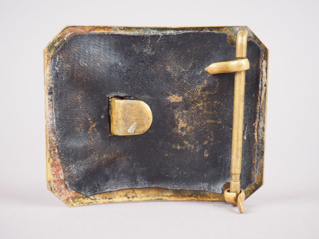 Grande plaque de ceinturon d’officier de gendarmerie rectangulaire en laiton doré embouti portant en son centre un cartouche en relief rectangulaire à pans coupés supportant sur fond grenu, un bel aigle non couronné sénestrogyre sur foudre et entouré des mots en lettres bâton en relief « GENDARMERIE IMPERIALE » et surmontant un cartouche en relief contenant le texte « SURETE PUBLIQUE » (100 mm x 75 mm). Canapé cuir noir au dos crochet étroit, et pontet à doubles ardillons. Etat 2+