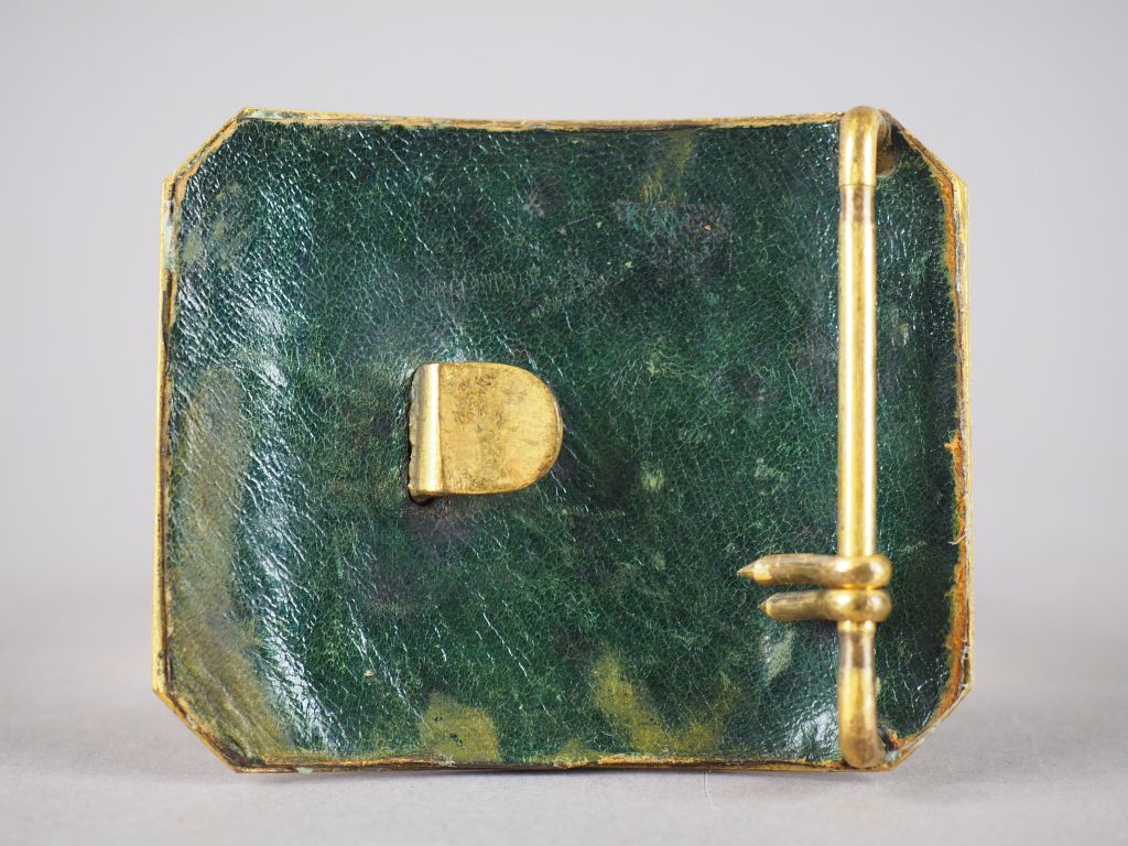 Grande plaque de ceinturon rectangulaire de gendarmerie (officier) en laiton doré embouti portant en son centre un cartouche en relief rectangulaire à pans coupés supportant sur fond grenu, un bel aigle non couronné sénestrogyre sur foudre et entouré des mots en lettres bâton en relief « GENDARMERIE IMPERIALE » et surmontant un cartouche en relief contenant le texte « SURETE PUBLIQUE » (100 mm x 75 mm). Canapé cuir vert au dos crochet étroit, et pontet à doubles ardillons. Etat 1+