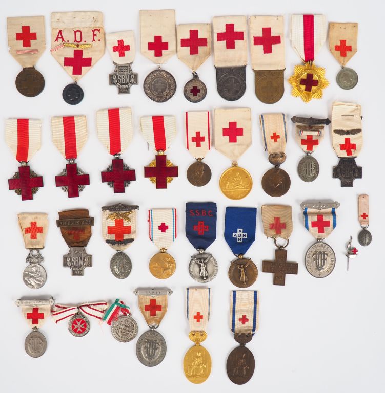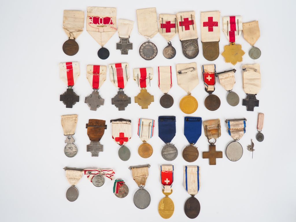 Important lot contenant une trentaine de décorations françaises autour du thème de la croix rouge et du secours aux blessés et des associations féministes de secours avec leurs rubans ( « Société française de secours aux blessés militaires des armées de terre et de mer 1914/1919 »avec ruban blanc et croix rouge, la même avec barrette « réfugiés 1939 », insignes d’infirmière avec ruban croix rouge avec barrettes, diverses tailles, numéros au dos :73,16816,11677,2156,2192, un croix en bronze de « secours aux blésés militaires 1870/1871 » avec ruban blanc et croix rouge, une belle médaille ronde en bronze argenté biface avec ruban blanc et croix rouge de « l’association des dames françaises reconnaissante » attribuée au revers à « Mr Diederich maire de Suresnes » en 1912, etc.) (Etat 1)