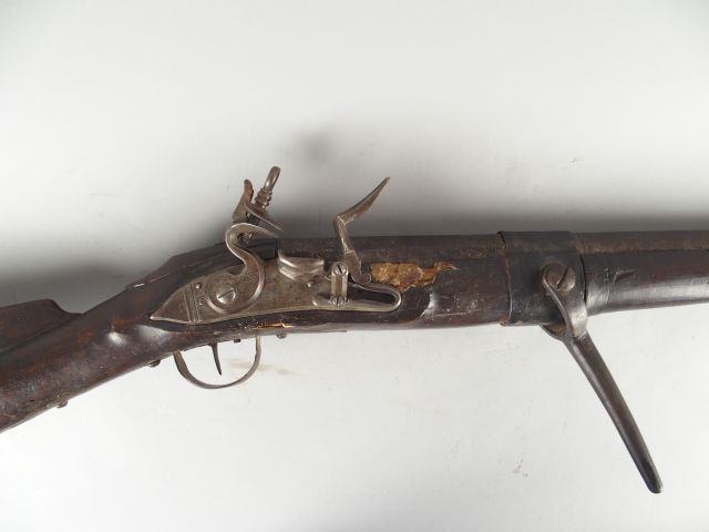 Imposante espingole à silex, arme dévolue à la marine marchande ou à la défense des places. Enorme platine à silex (230mm de long), corps plat, chien à espalet, vis de chien à anneau, bassinet à pans figurés, venu de forge avec le corps de platine. Plaque de jonction caractéristique des armes du système 1717 fixant le ressort de batterie sur la vis de bassinet. Grosse et imposante crosse pied de vache, accident à la mise en bois de la platine réparé à la patte à bois (restaurable).Canon fer rond forte moulure à la bouche calibre 28mm lisse de 800 mm de long. Fourquine fixée sur les tubes et permettant de fixer l’arme sur un plat bord de navire ou sur un rempart pour balayer un assaut pour peu que l’on charge d’une bonne dose de dragée l’arme. Longueur hors tout 1260mm. Bel objet de curiosité, très décoratif et rarement rencontré (2)