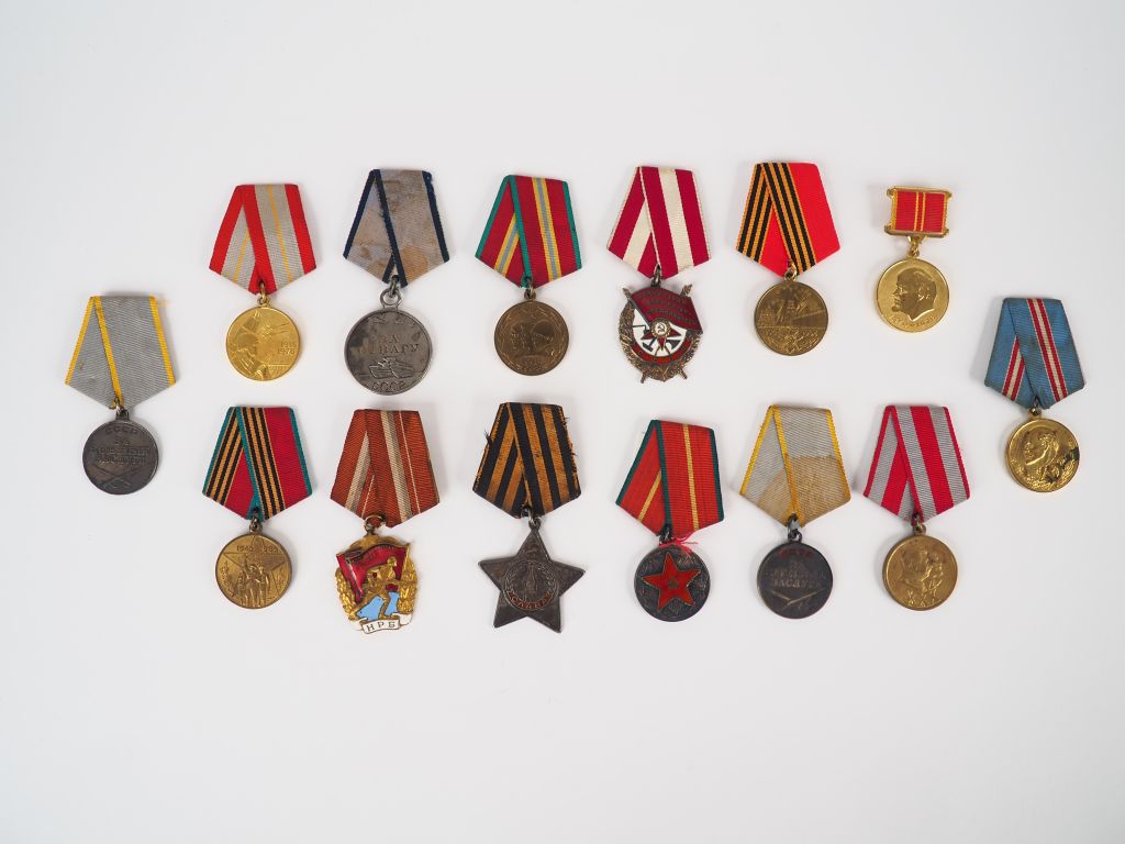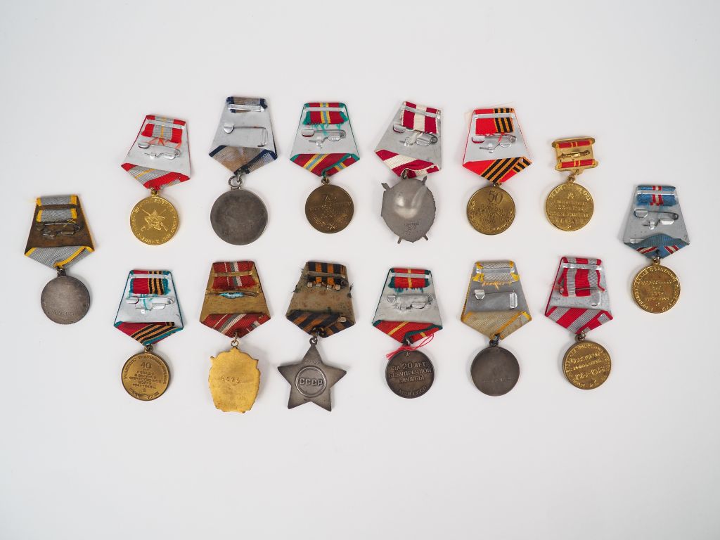 Intéressant lot de 14 décorations soviétiques avec leurs rubans spécifique, modules rond en bronze on y trouve : 30 éme, 40 éme et 70 éme anniversaire de l’armée rouge, 20 ans au service du ministère de l’intérieur, 40 éme anniversaire de la fin de la guerre, 50 éme anniversaire de la victoire,60 éme anniversaire de 1918, un ordre du drapeau rouge second modèle, une médaille de la valeur numéro d’attribution au dos « 685927 »,une étoile argent et émail de l’ordre de la gloire, numéro d’attribution au dos « 442020 », une médaille du service combattant attribution au dos nr « 3058290 », une médaille du mérite au combat numéro au dos « 2804159 », une médaille du 30 éme anniversaire des forces armées, et une médaille patriotique. (Etat 1)