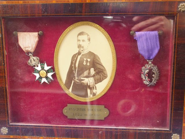 Joli tableau contenant un portrait en pied d’un haut fonctionnaire en tenue de gala époque troisième république épée au coté, et deux décorations à savoir sa légion d’honneur second empire (étoile de chevalier présentée face revers) et les palmes académiques. Plaque nominative dans le cadre : Hyacinthe Rouéde 1822/1889. 1