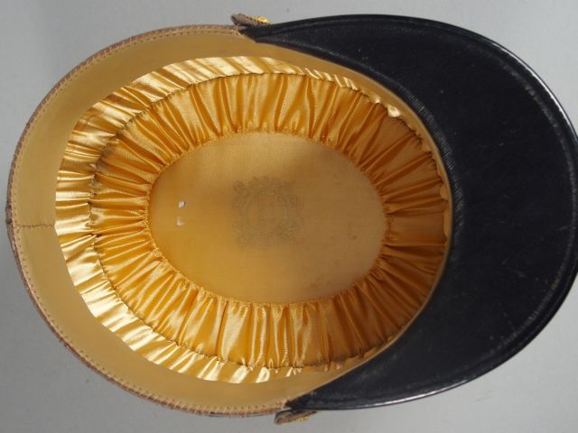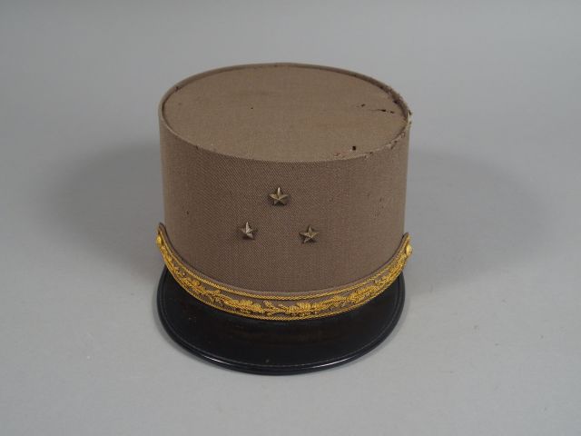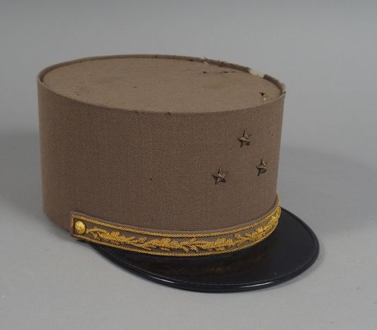 Képi de général de division (trois étoiles) Français après 1945. Corps en drap vert, fausse jugulaire en canetille dorée, boutons de général, intérieur saumon fabriquant à Alger, quelques attaques de mites. (2)