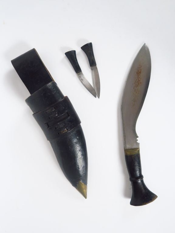 Kukris Népalais dans son fourreau habillé de cuir noir à âme bois, passant de ceinture en cuir fauve, fusée bois, pommeau en feuille de laiton à décor cuivre stylisé, l'arme est accompagnée de ses deux batardeaux (réduction de l'arme principale). (1-). Arme de catégorie D.