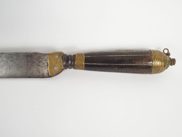 Long coutelas XIXème Europe du sud, fusée en corne cylindrique cloisonnée de filigrane longitudinal de fil de laiton torsadé. Pommeau rond, bouton de rivure proéminent gravure au trait, virole laiton gravée, pas de garde, longue lame symétrique plate à dos de 510 mm de long .1-